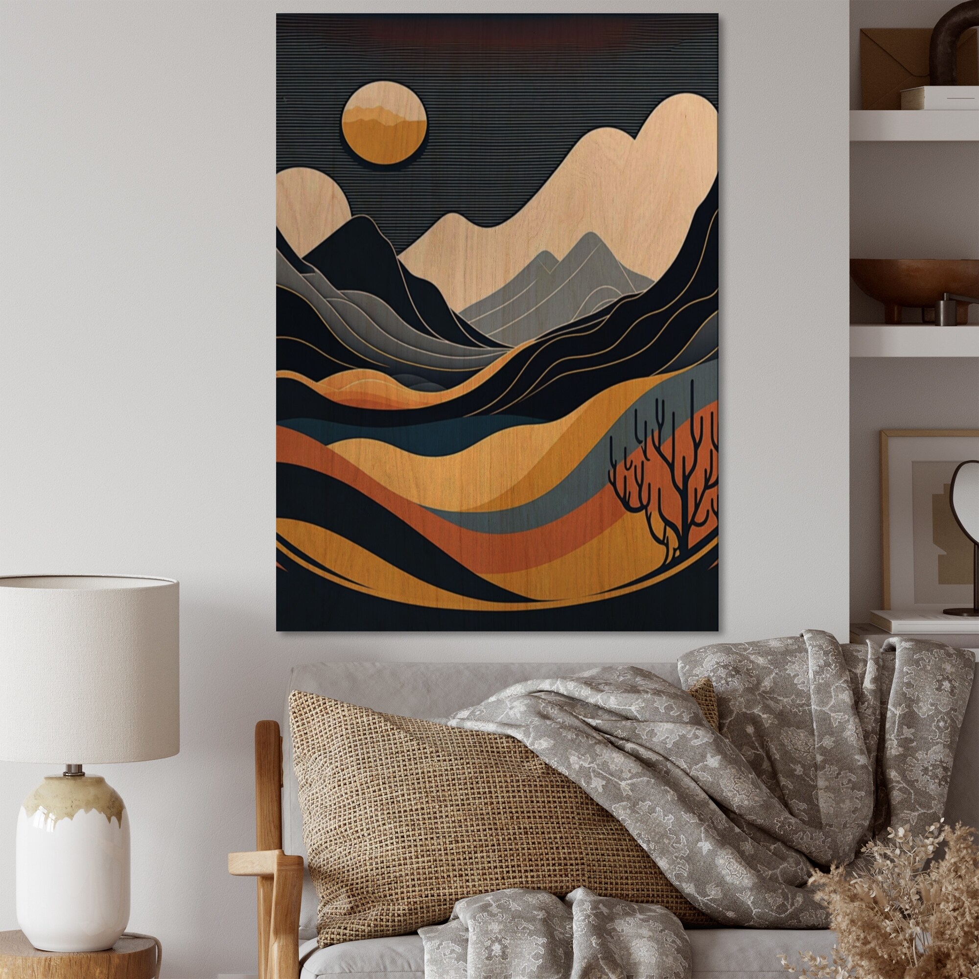 Designart 'Yellow Graphic Moon in the Mountains III' Landscape Mountains Wood Wall Art - Natural Pine Wood