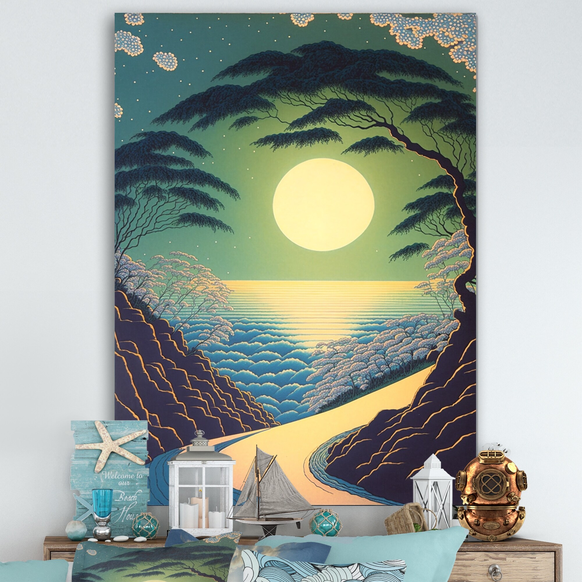 Designart "Full Moon Over the Mountains I" Landscape Mountains Canvas Wall Art