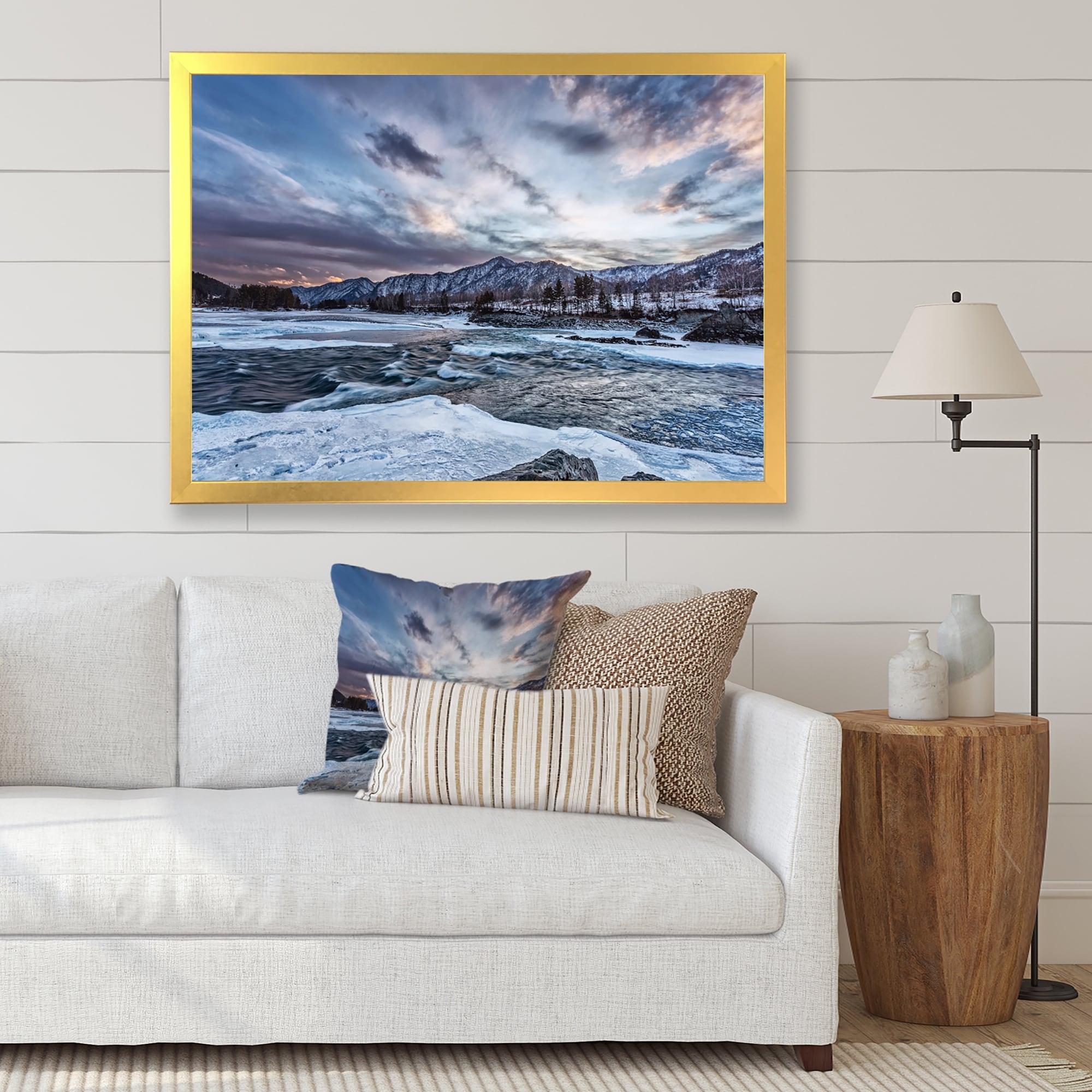 Designart "Old Mountain River Among Snow At Sunrise" Lake House Framed Art Print