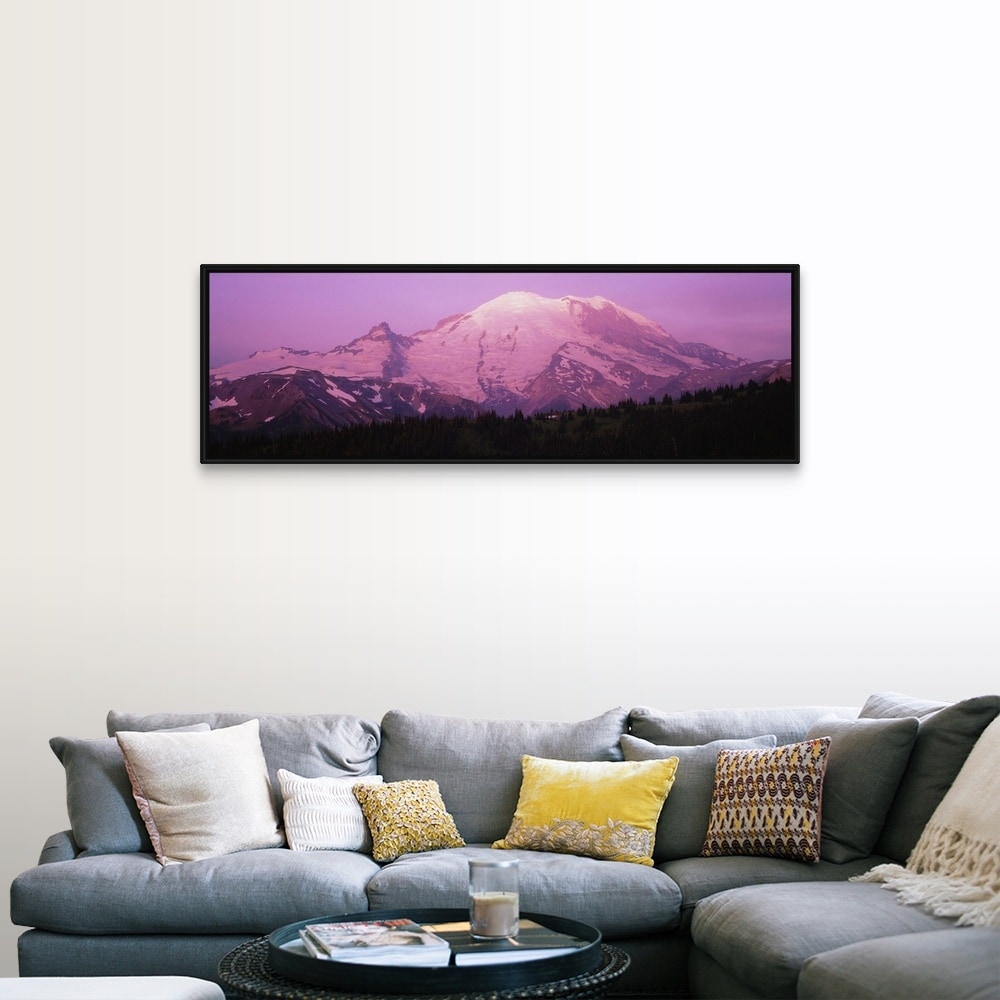 "Snow covered mountain at sunrise, Mt Rainier, Washington State" Black Float Frame Canvas Art