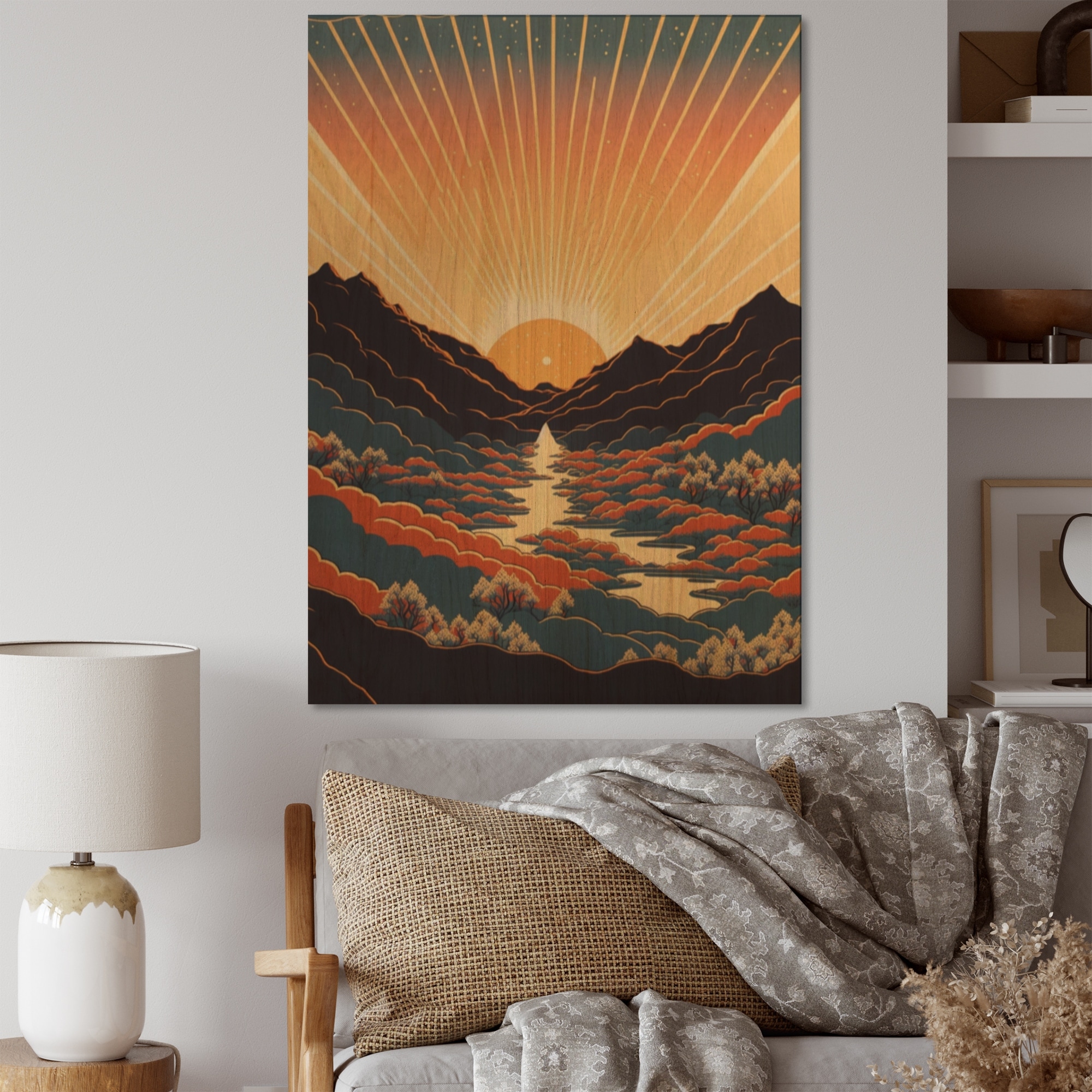 Designart 'Sunrise Over the Mountaine Lake I' Landscape Cottage Wood Wall Art - Natural Pine Wood