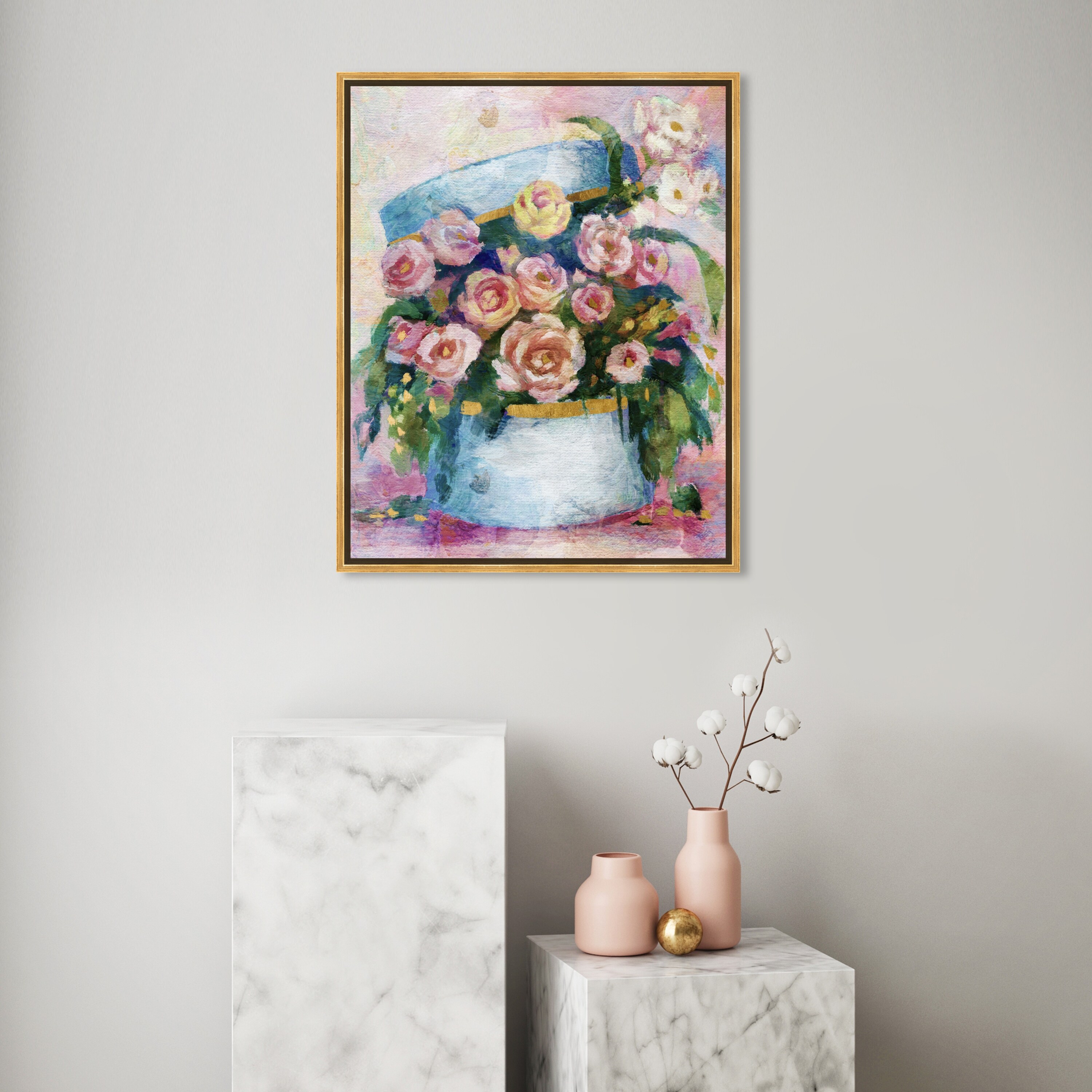 Oliver Gal 'Flowers in Blue Box' Floral and Botanical Wall Art Framed Canvas Print Florals - Blue, Pink