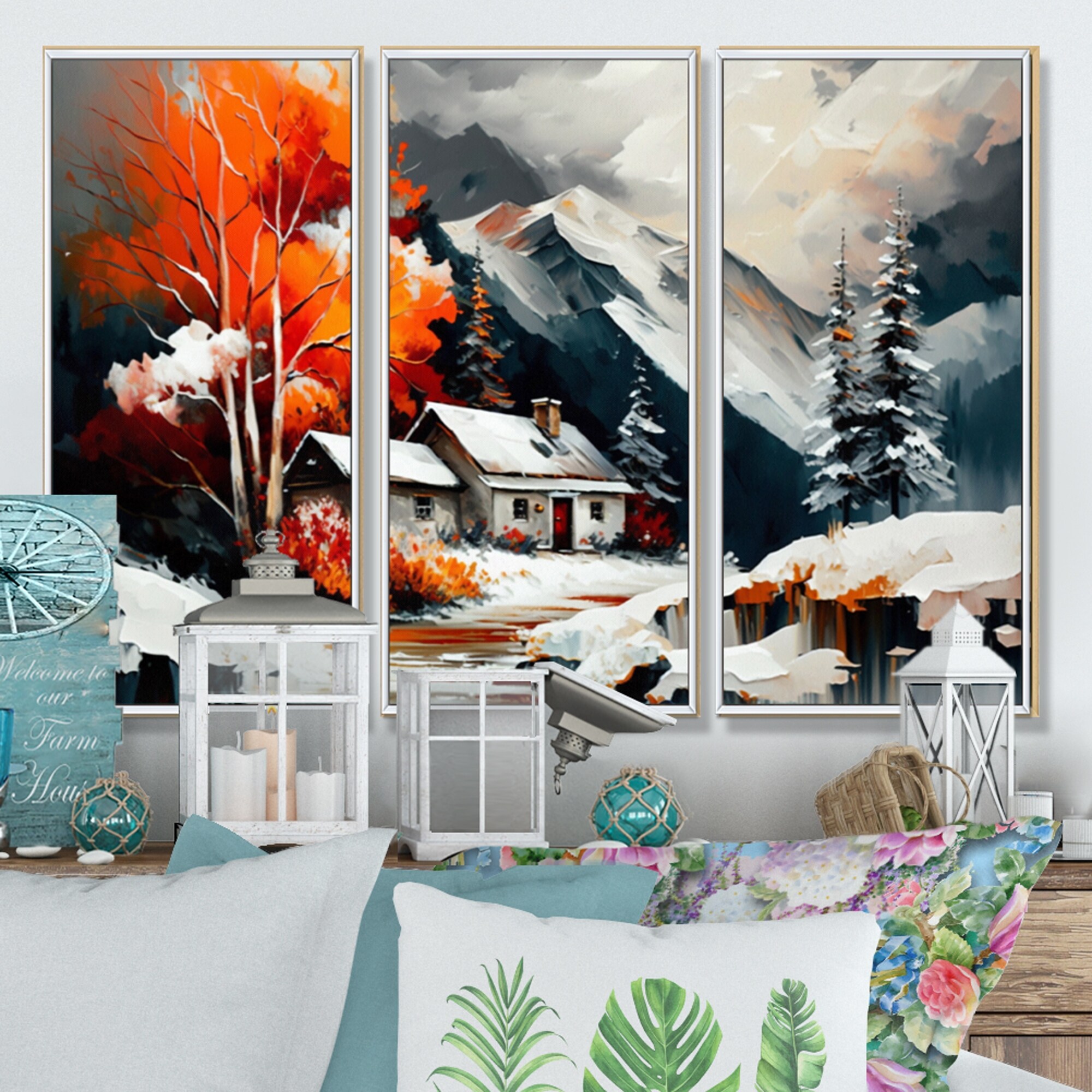 Designart "Monochrome Orange Cottage in Winter III" Cottage Landscape Framed Canvas Art Print - 3 Panels