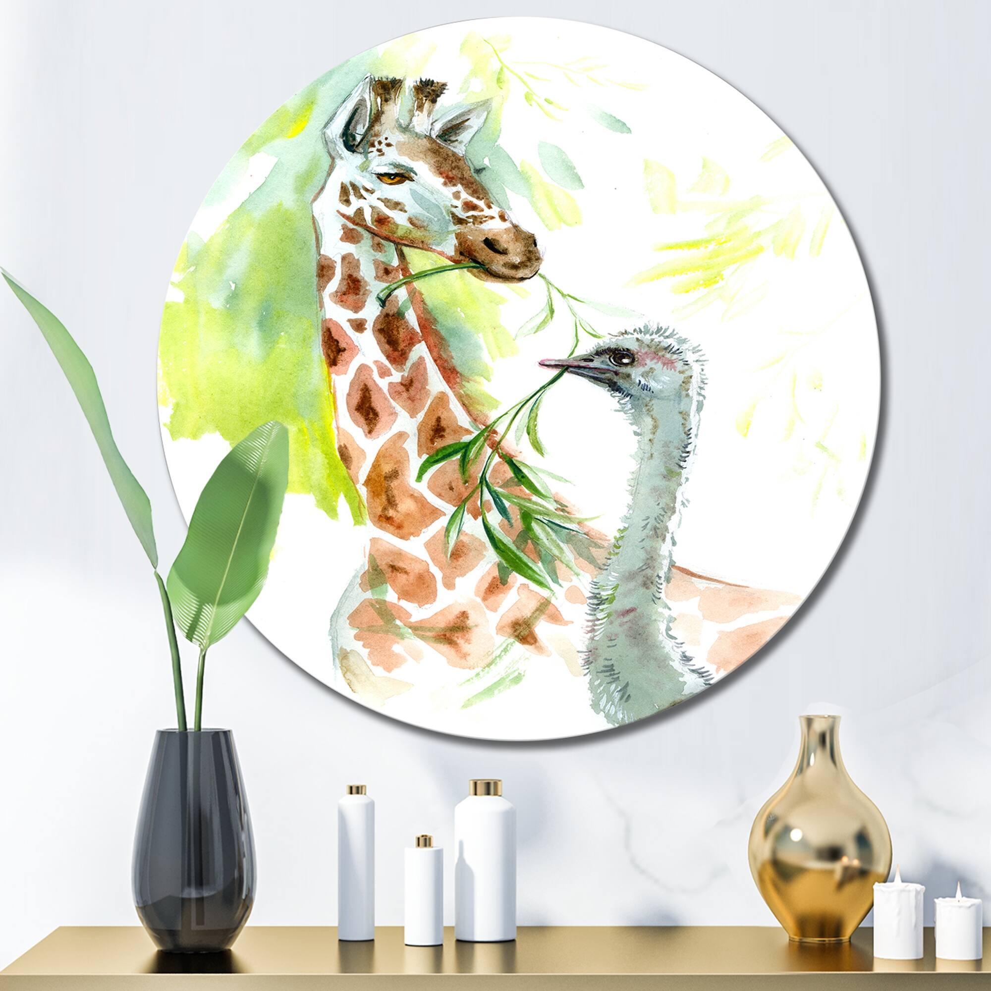 Designart 'Portrait Of a Giraffe And an Ostrich' Traditional Metal Circle Wall Art