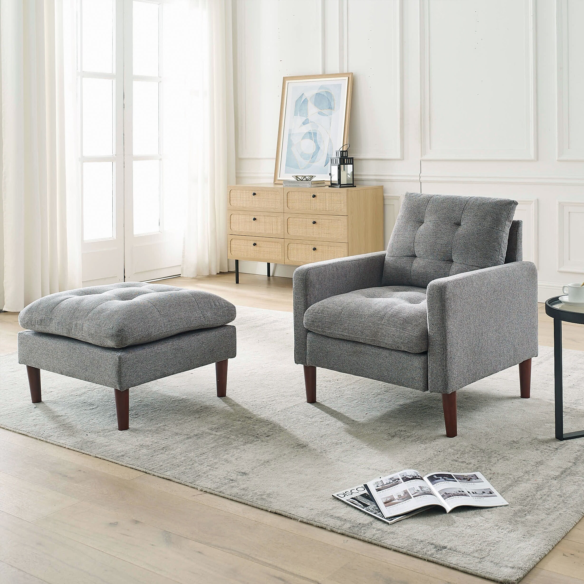 Tufted Fabric Armchair with Solid Wood Legs and Ottoman