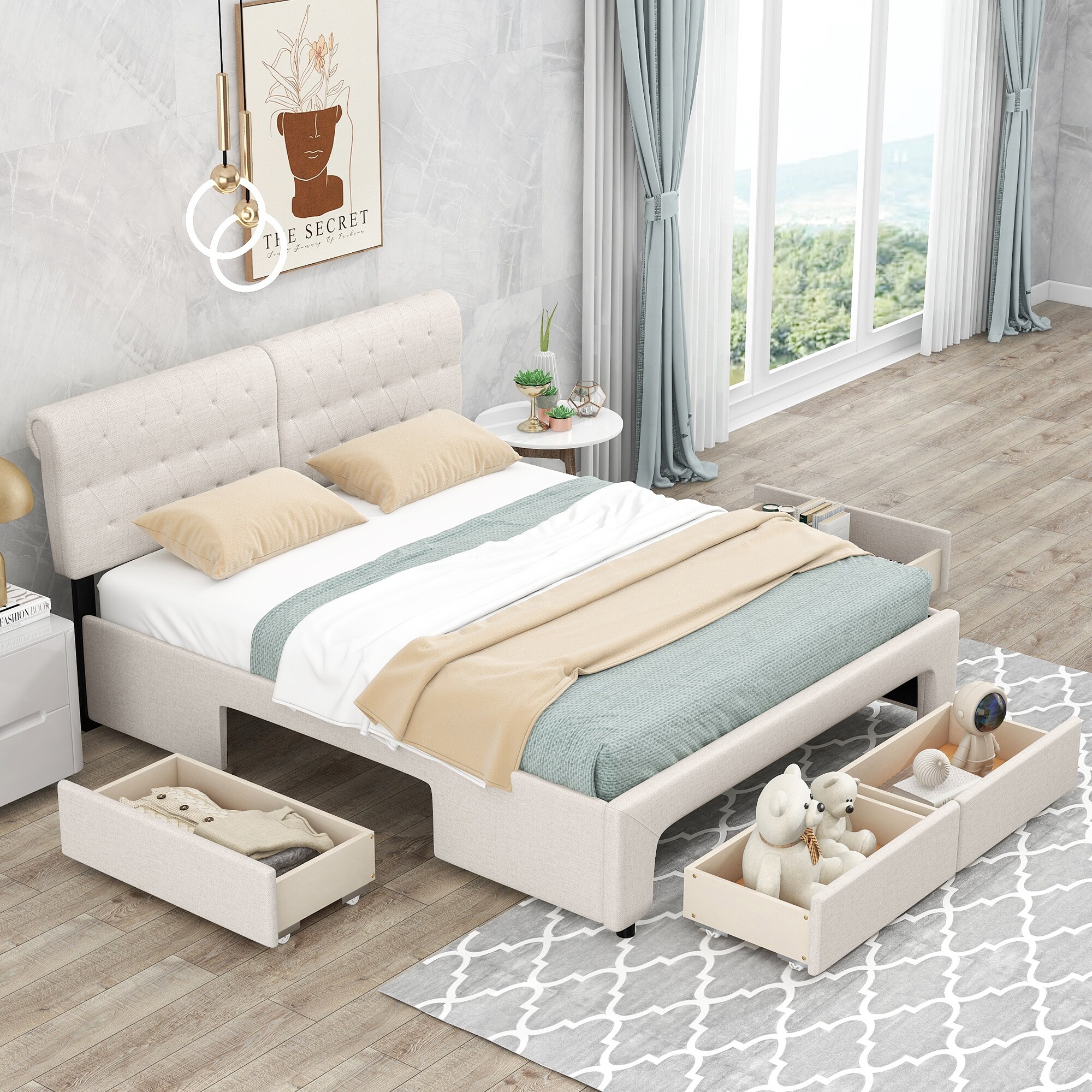 Queen Size Linen Upholstered Platform Bed with Tufted Headboard, 4 Storage Drawers and Wood Frame