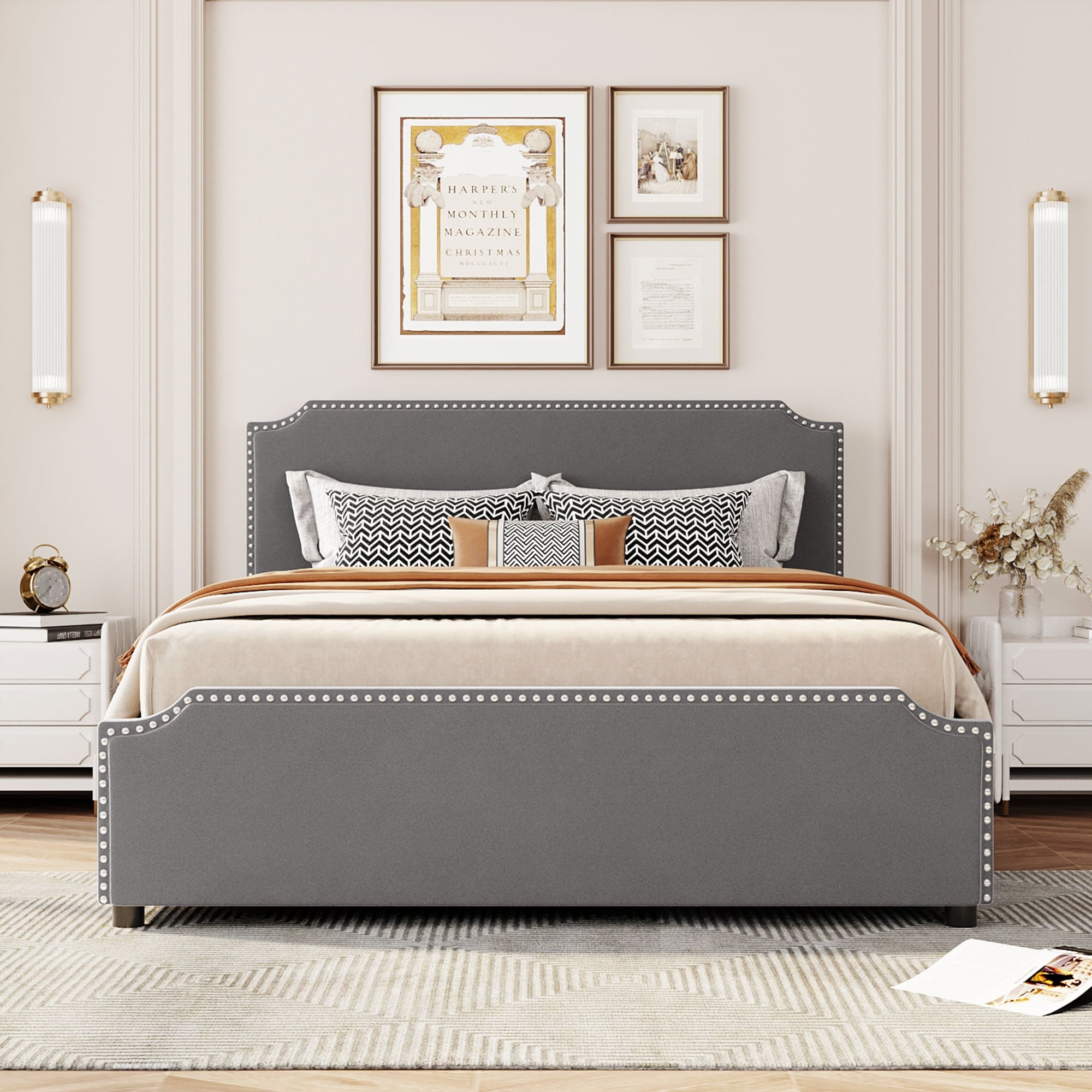 Queen Size Platform Bed Frame w/ Stud Trim Headboard, Gray