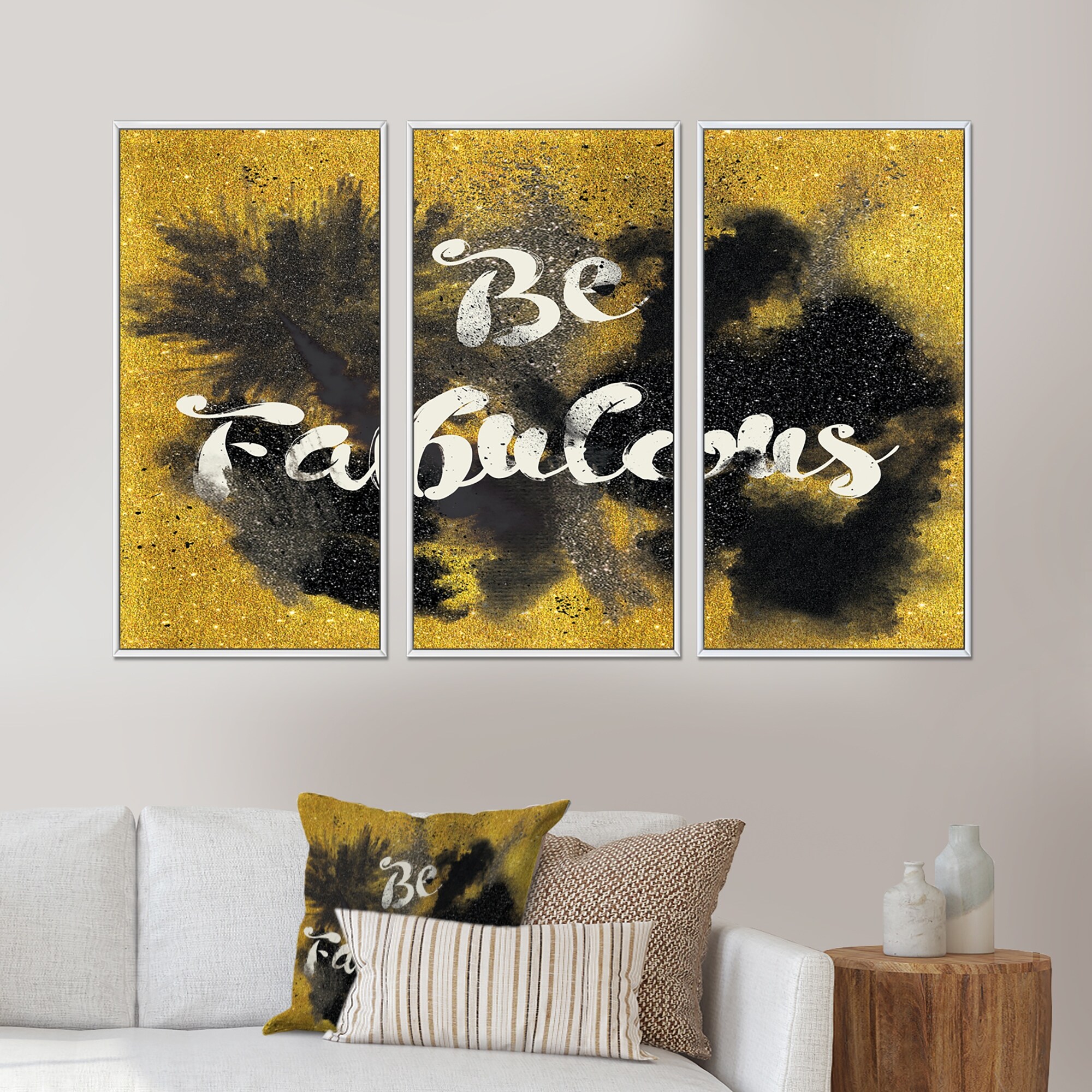 Designart "Be Fabulous Quote Black on Gold" Traditional Framed Canvas Wall Art Set of 3 - 4 Colors of Frames