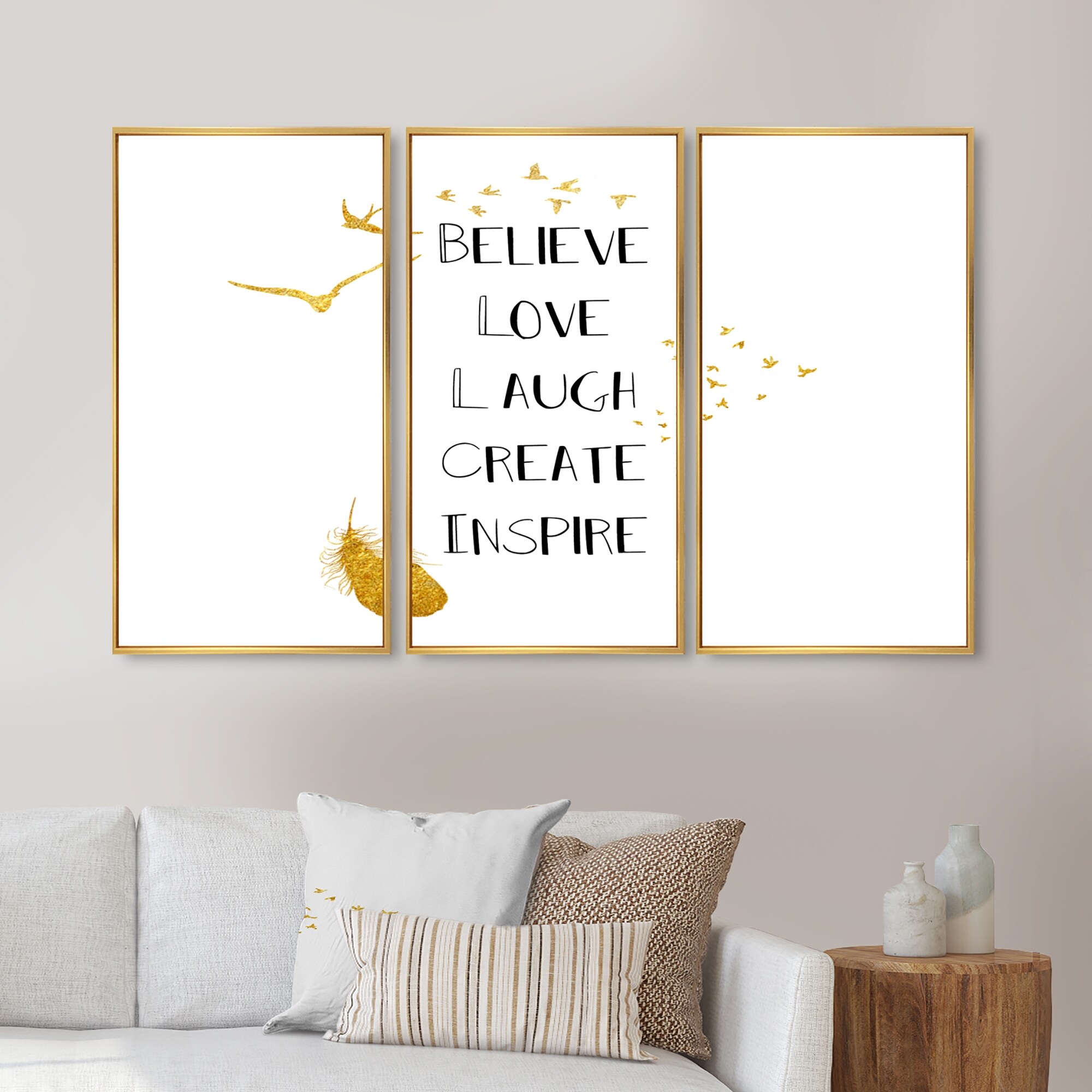 Designart "Inspirational Quote on White and Gold" Traditional Framed Wall Art Set of 3 - 4 Colors of Frames