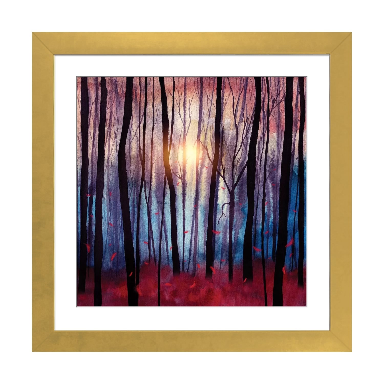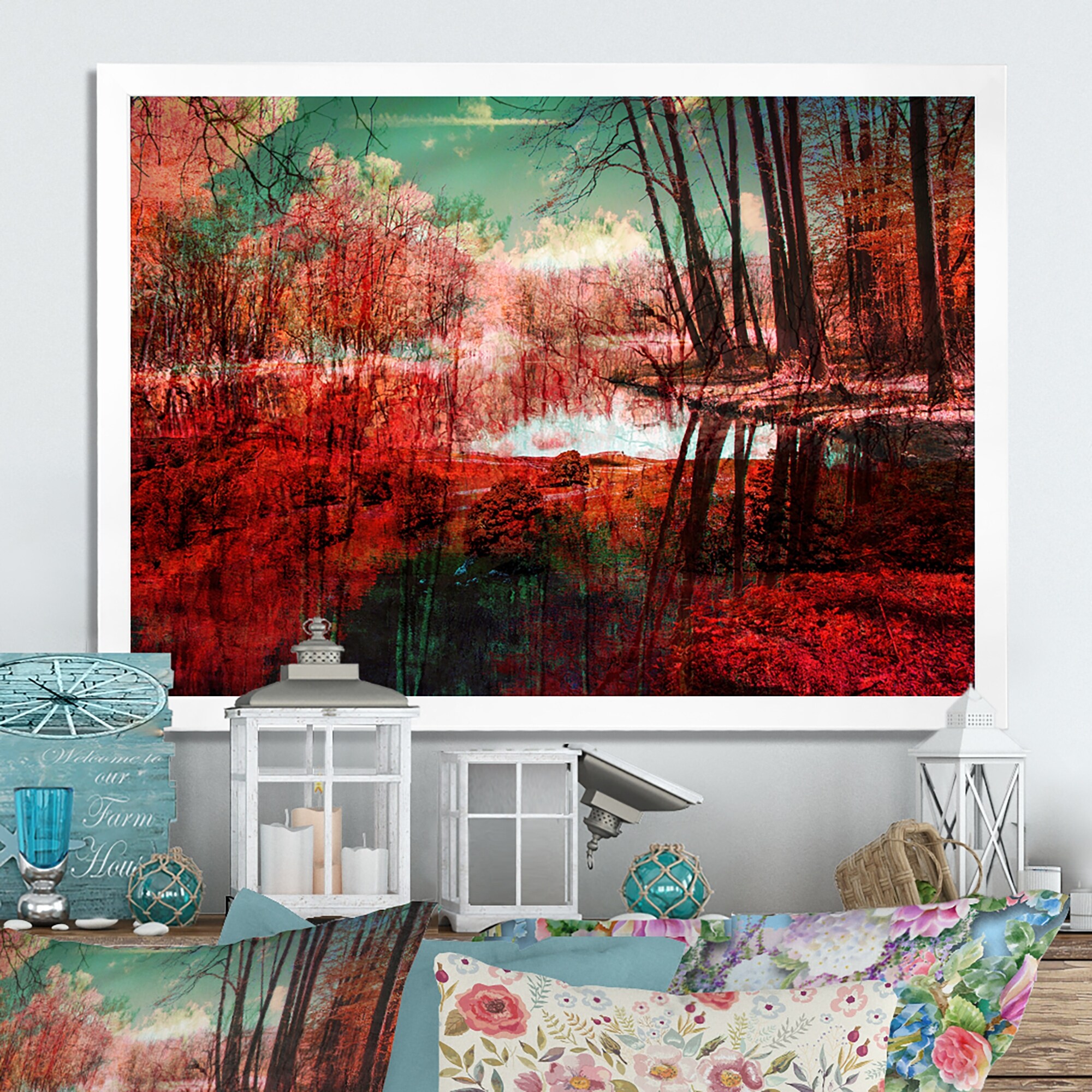 Designart "Red Autumn Artistic Forest By the Lake" Traditional Framed Wall Art