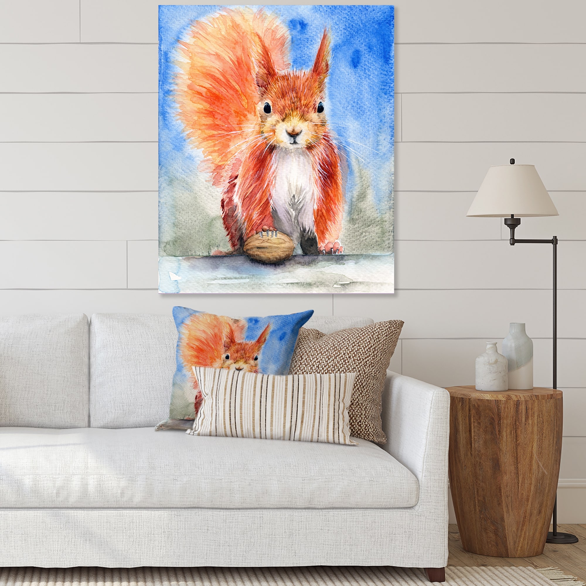 Designart "Cute Red Fluffy Squirrel on Blue" Traditional Canvas Wall Art Print