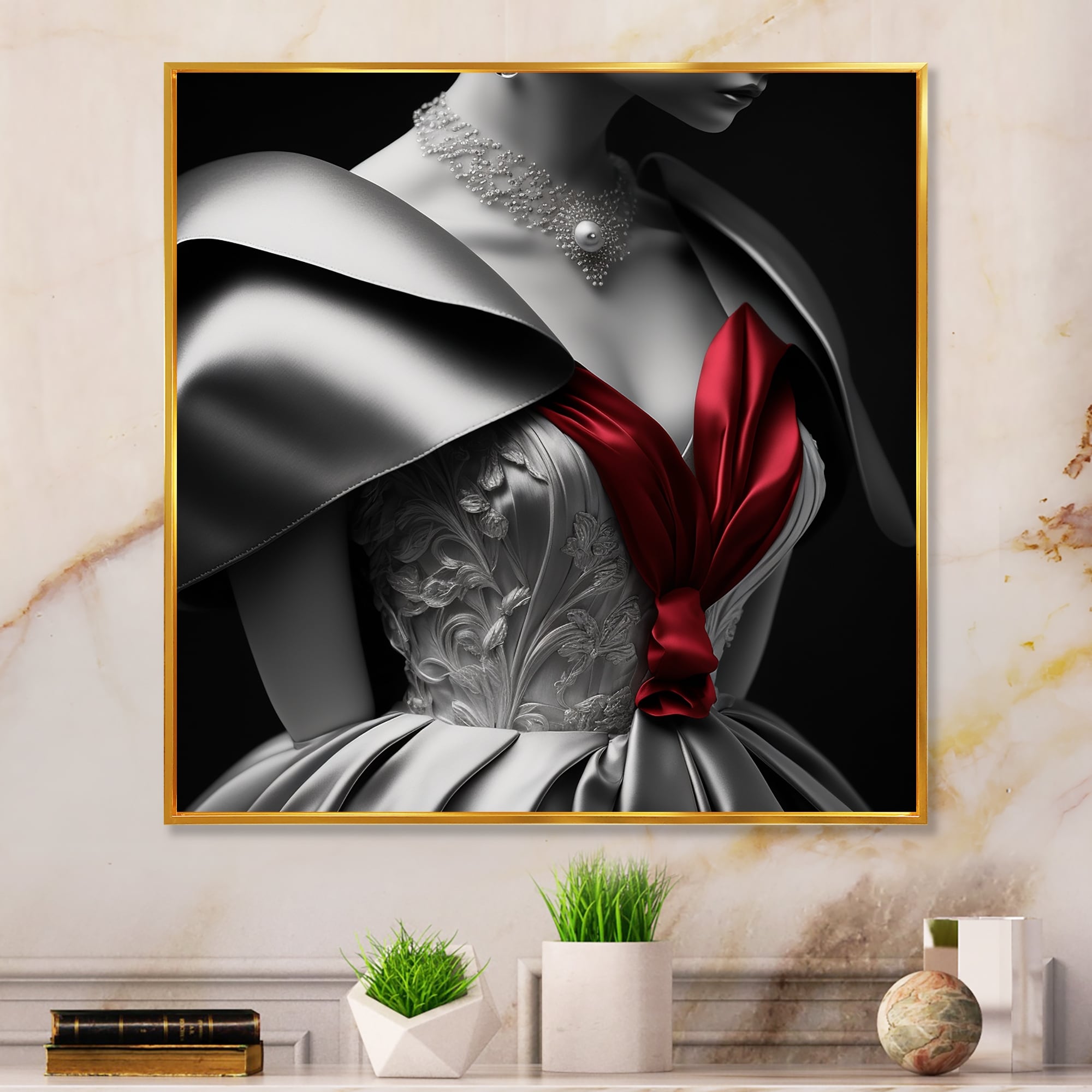 Designart "Vintage Buste in Red II" Fashion Woman Framed Canvas Wall Art Print