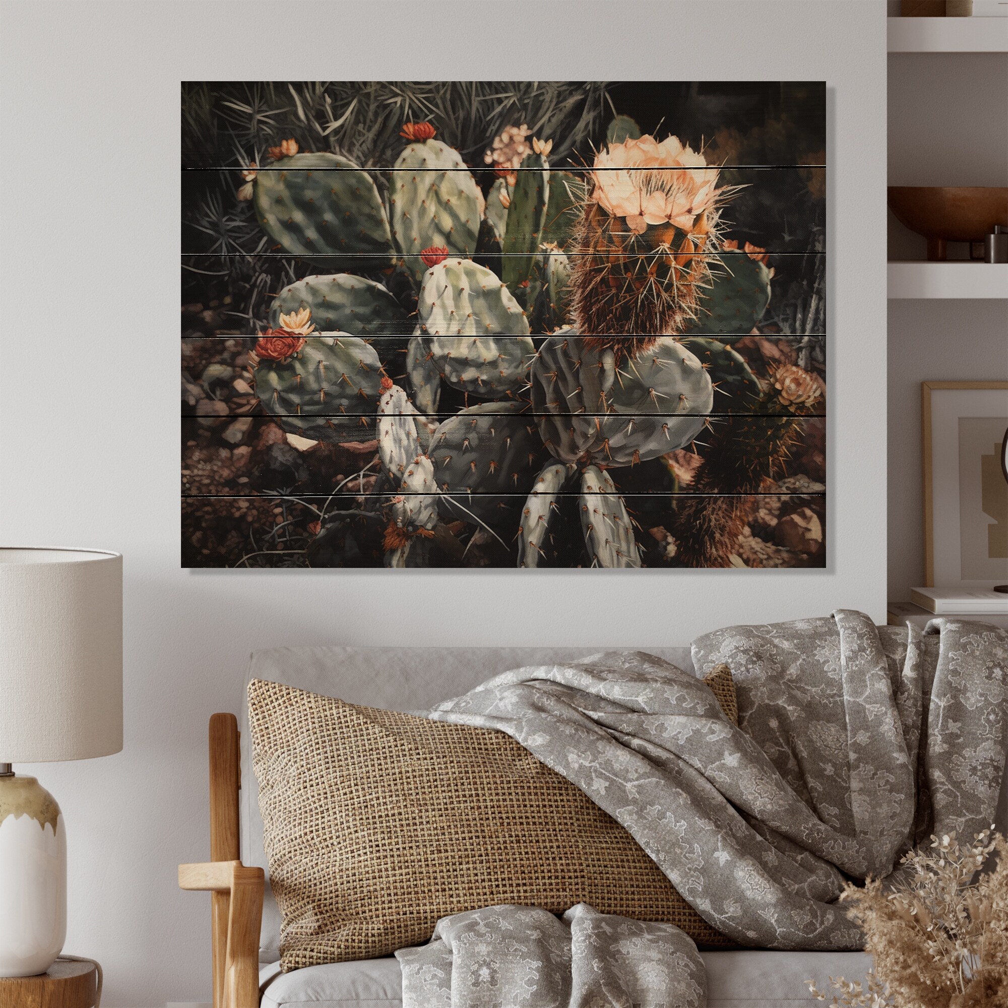 Designart "Red Green Cactus Scenery" Floral Cactus Print on Natural Pine Wood