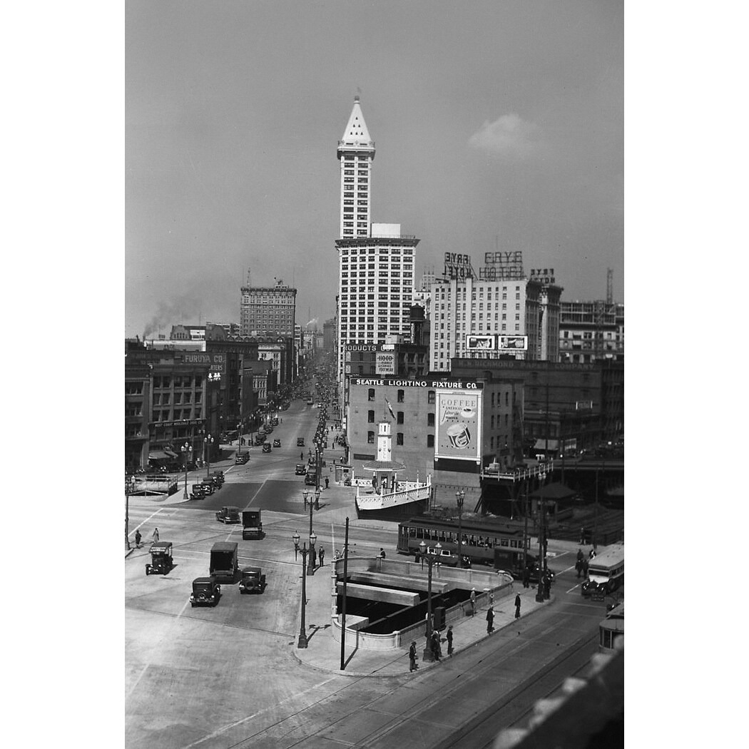 Second Avenue and Smith Tower Black and White Gallery Wrapped Canvas