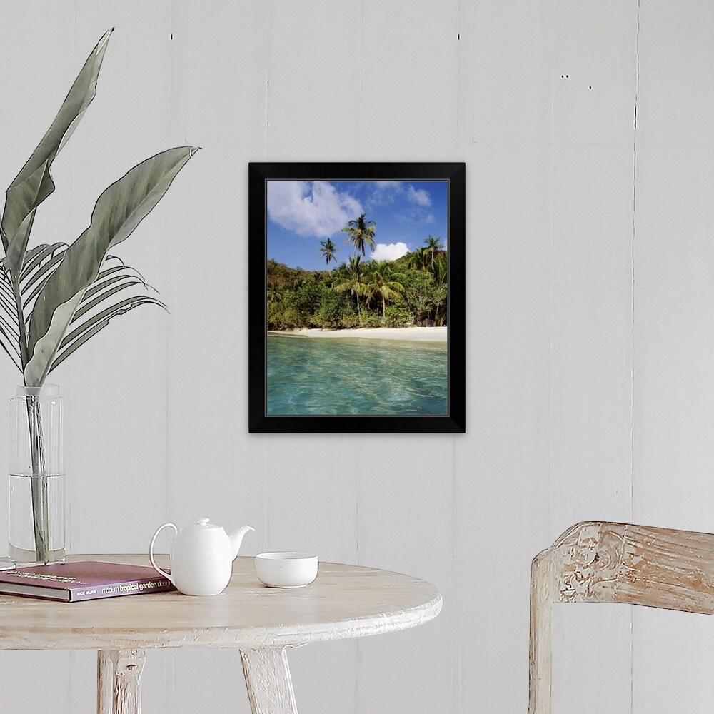 "US Virgin Islands, St. John, Cruz Bay, Palm trees on the beach" Black Float Frame Canvas Art