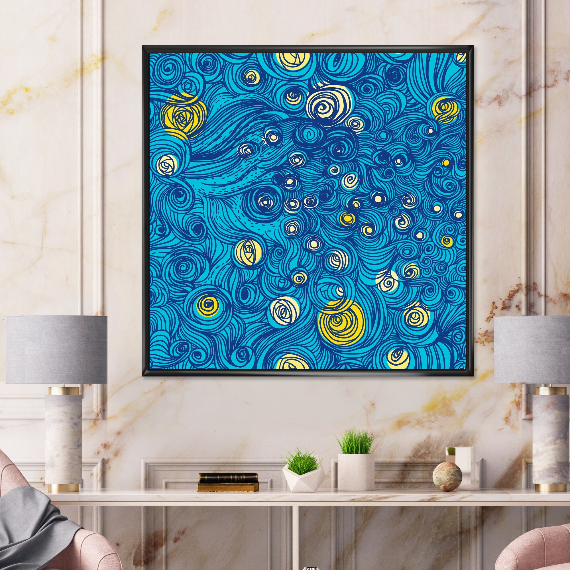 Designart "Starry Night Yellow And Blue" Modern Framed Canvas Wall Art Print