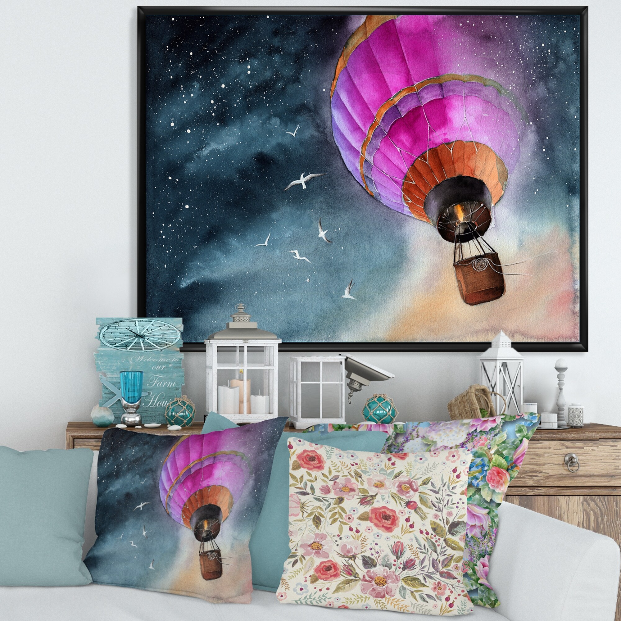 Designart "Pink Air Balloon in Starry Night" Country Framed Canvas Wall Art Print