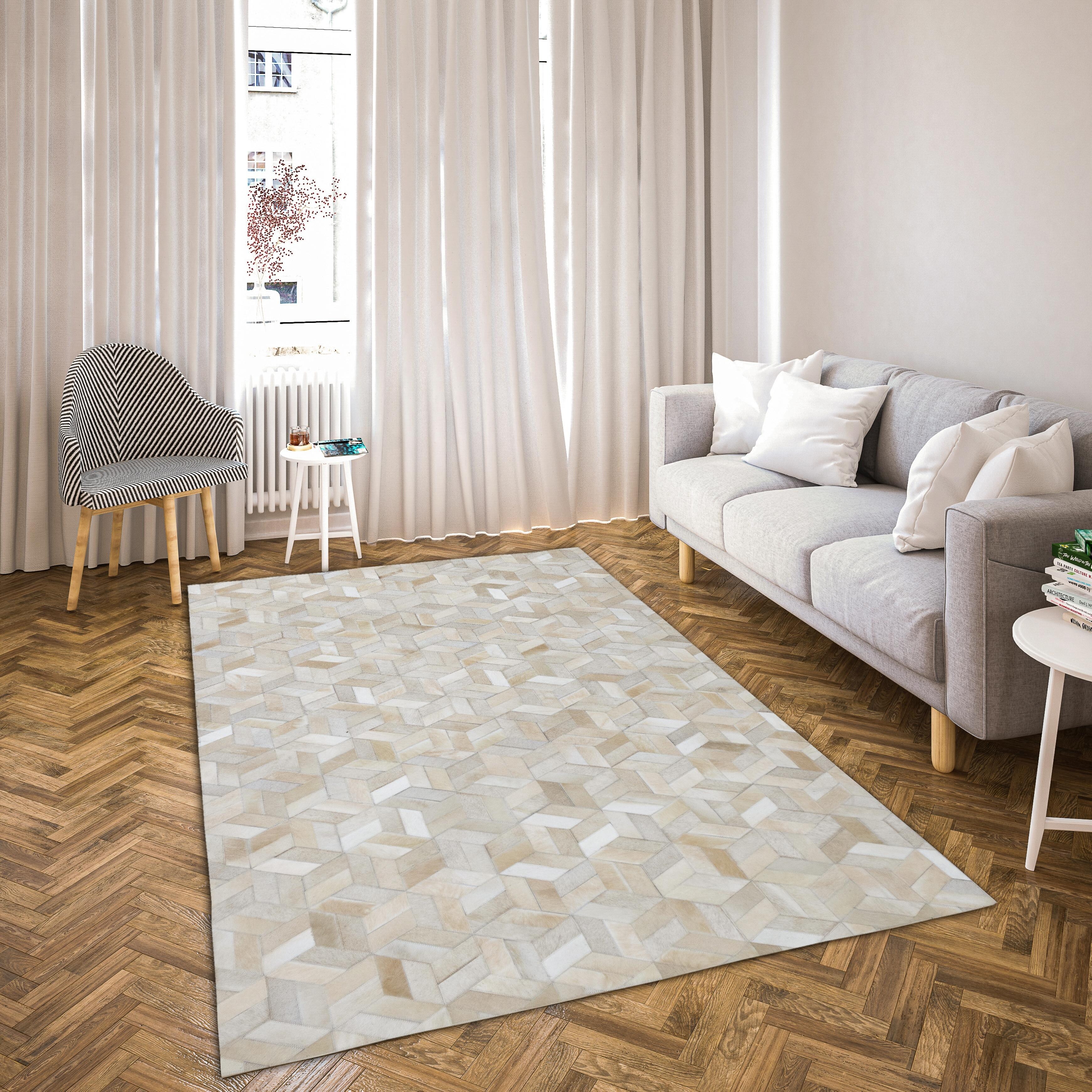Hand-Stitched Ivory and Beige Geometric Leather Area Rug by Tufty Home - 5' x 8'