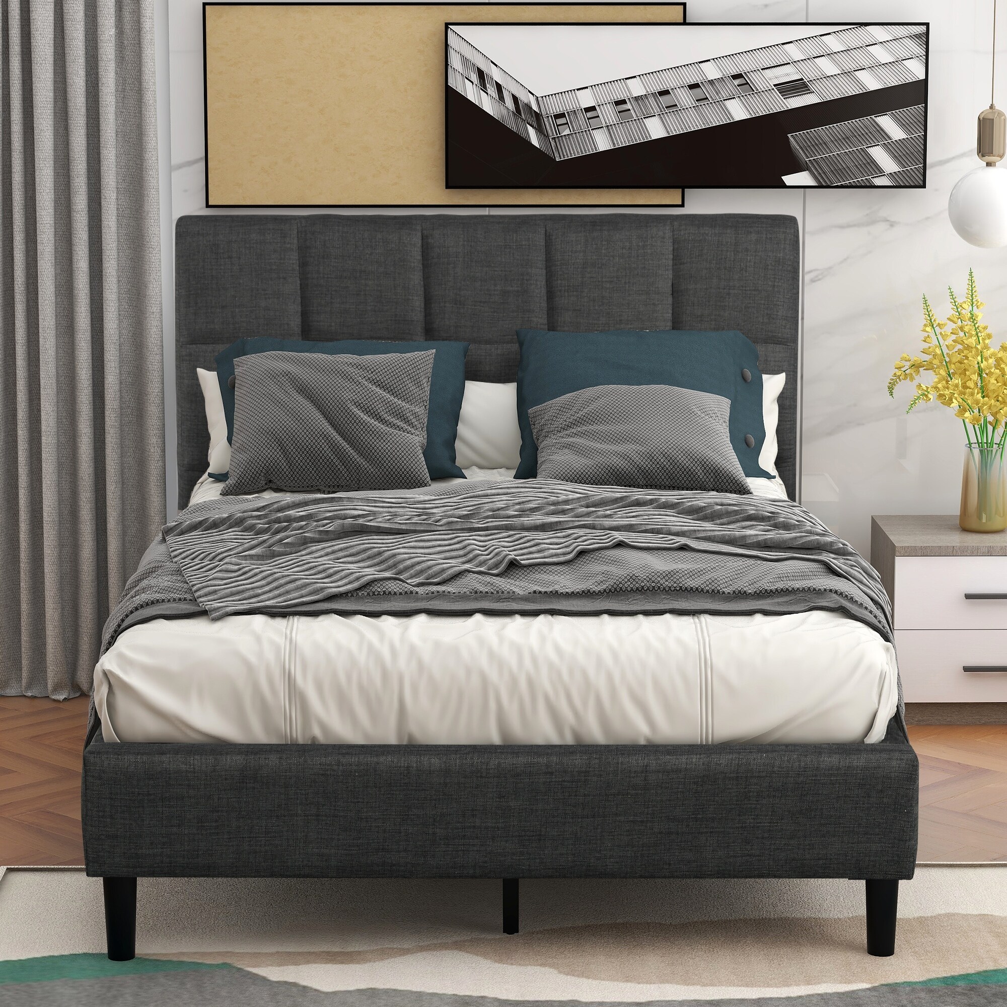 BIKAHOM Upholstered Platform Bed with Square Stitch Headboard, Queen, Dark Grey