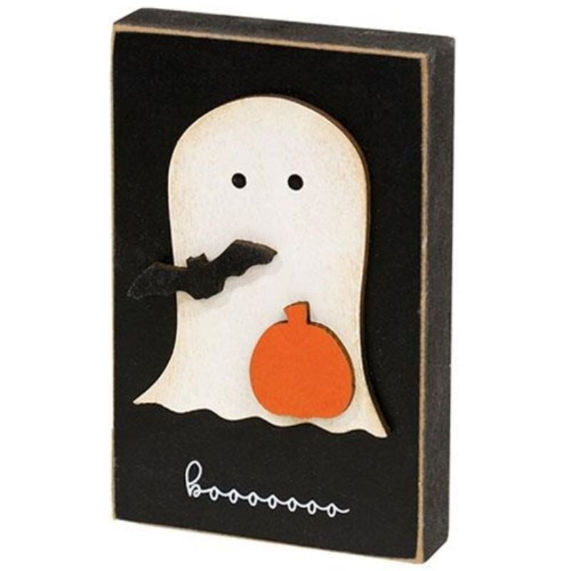 Boooo Pumpkin & Bat Ghost Block - 4.5” high by 3” wide by .75” deep.