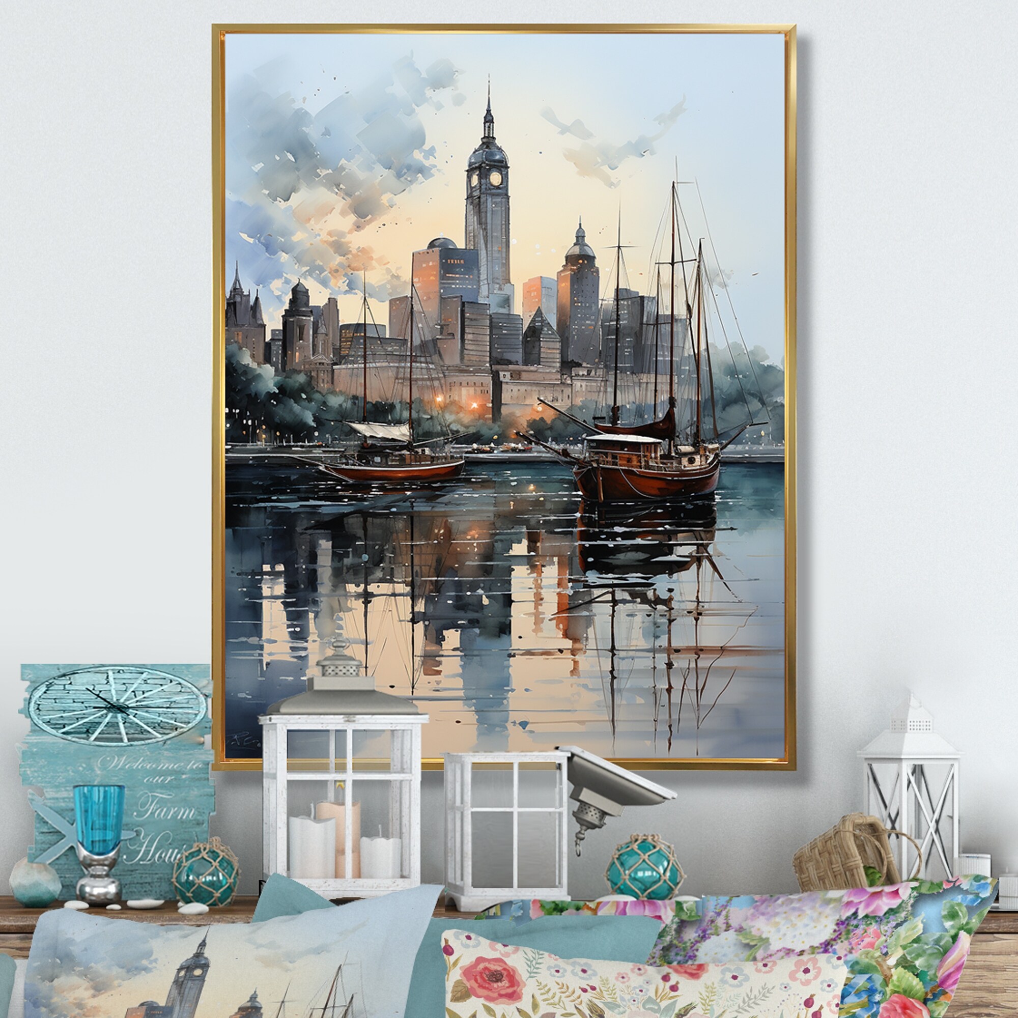 Designart "New York Harbor Twilight" City New York Framed Canvas Wall Art