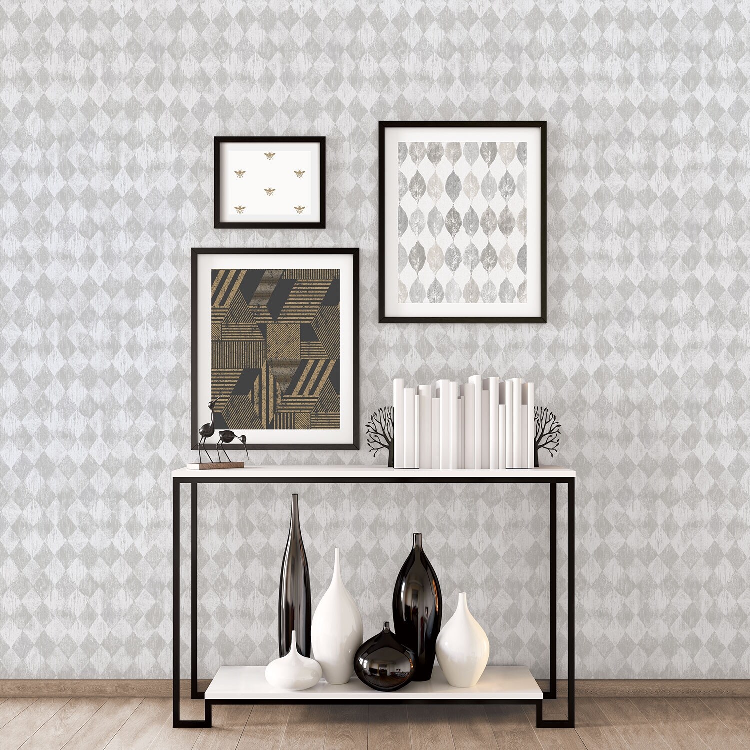 Nottingham, Vinyl Harlequin in White And Silver Wallpaper, 20.5 in X 33 Ft = 56 Sq Ft
