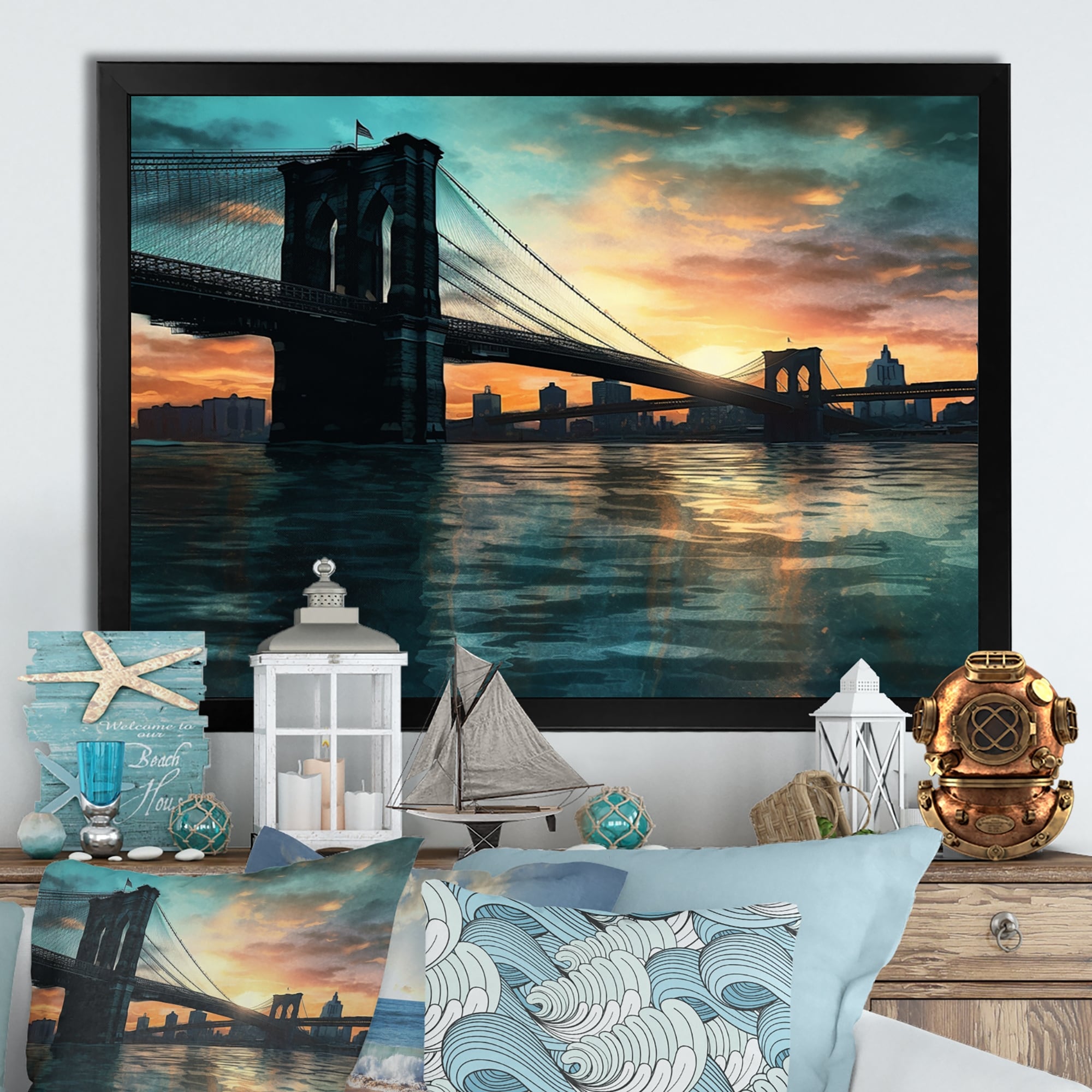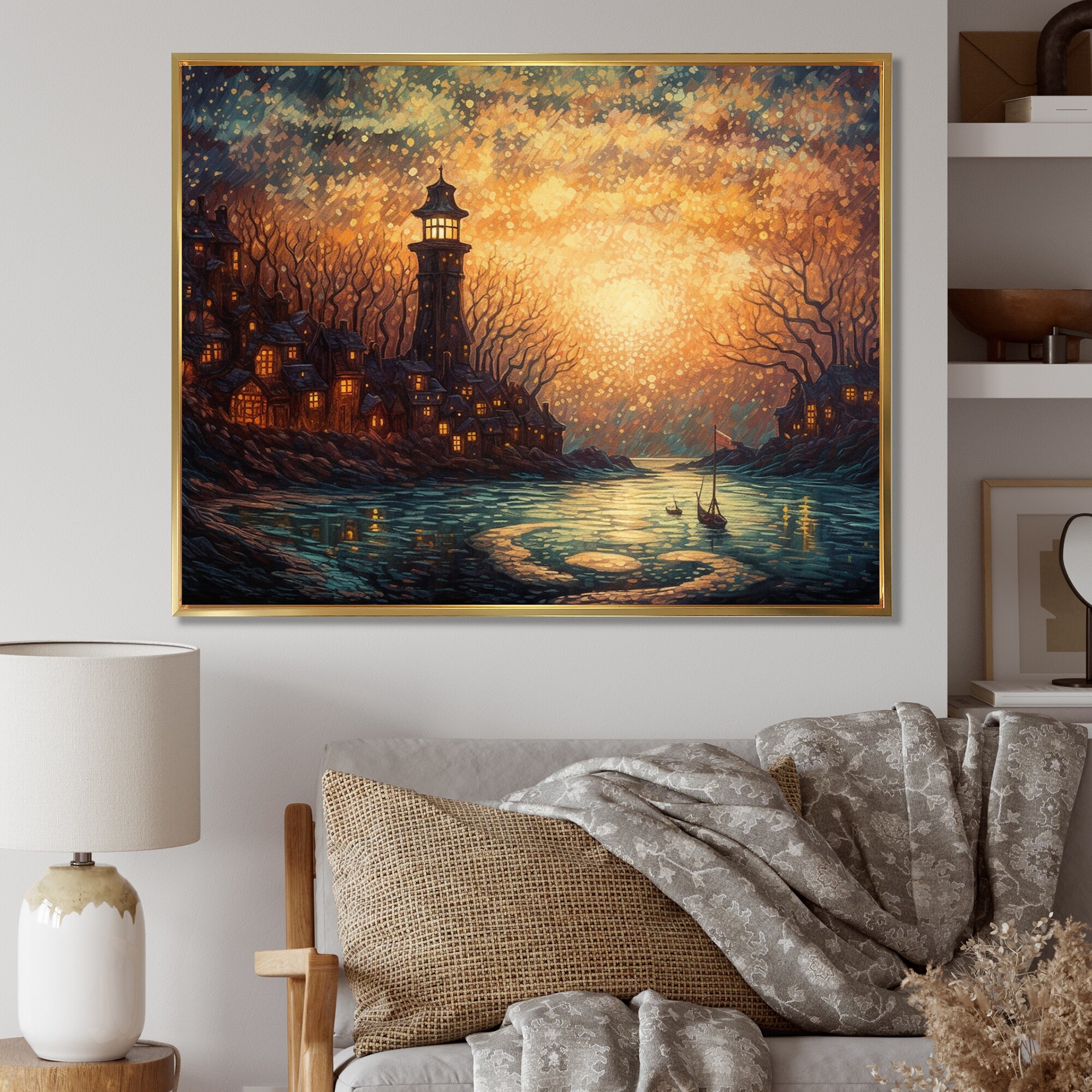 Designart "Waterfront Cityscape I" City Art Deco Framed Canvas Wall Art