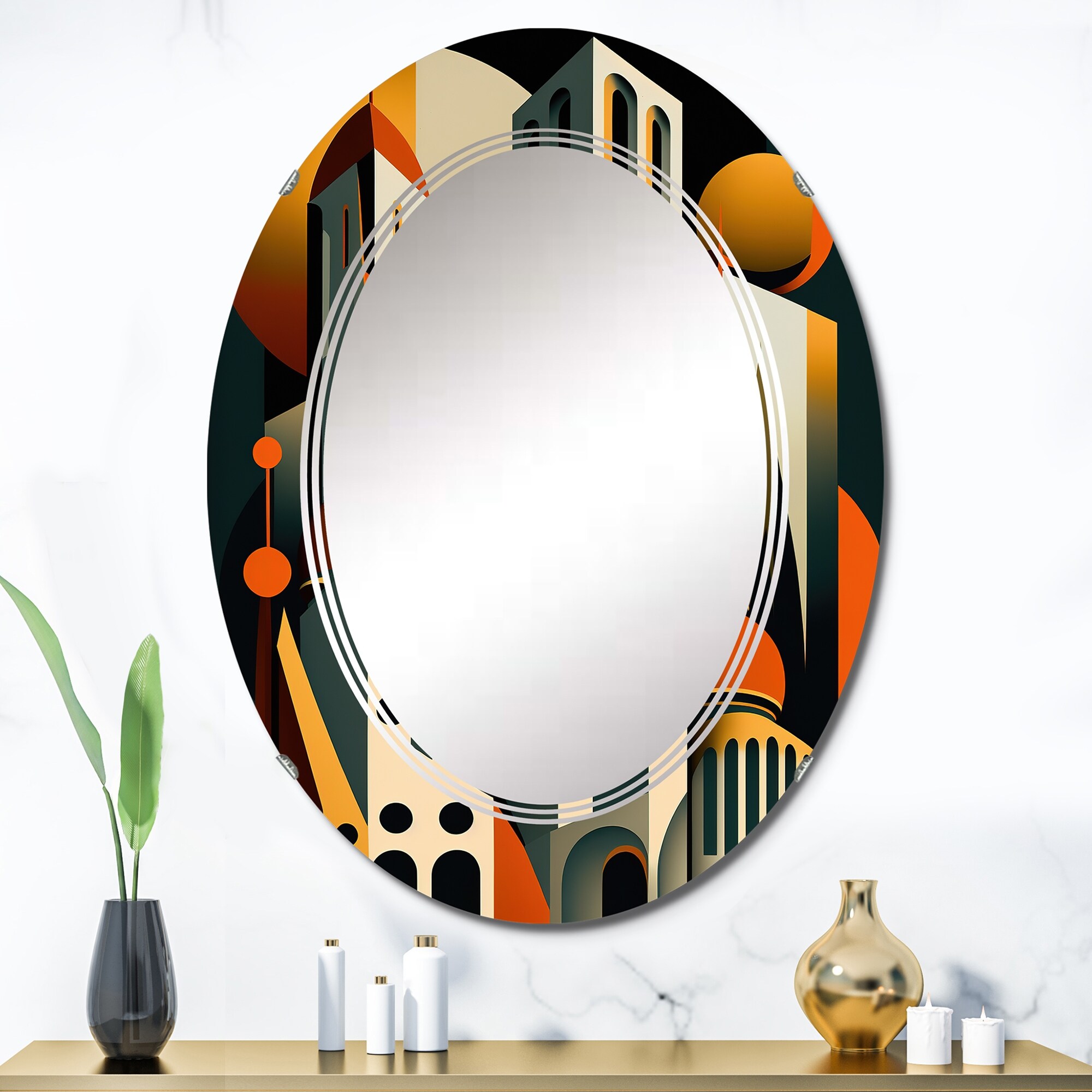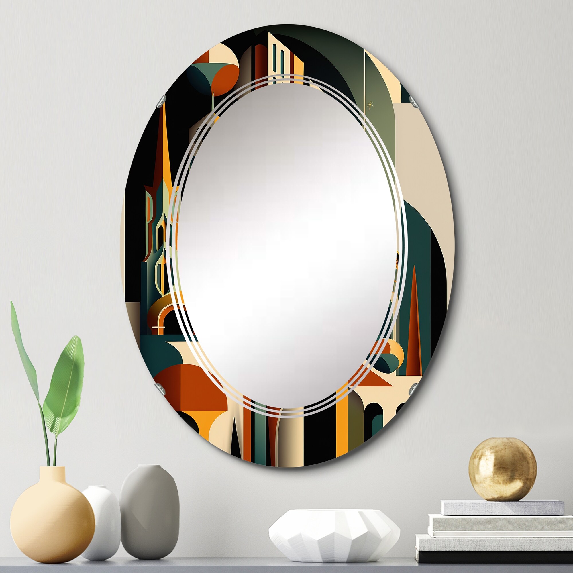 Designart 'Art Deco Seal pattern' Printed Modern Round or Oval Wall Mirror - Triple C