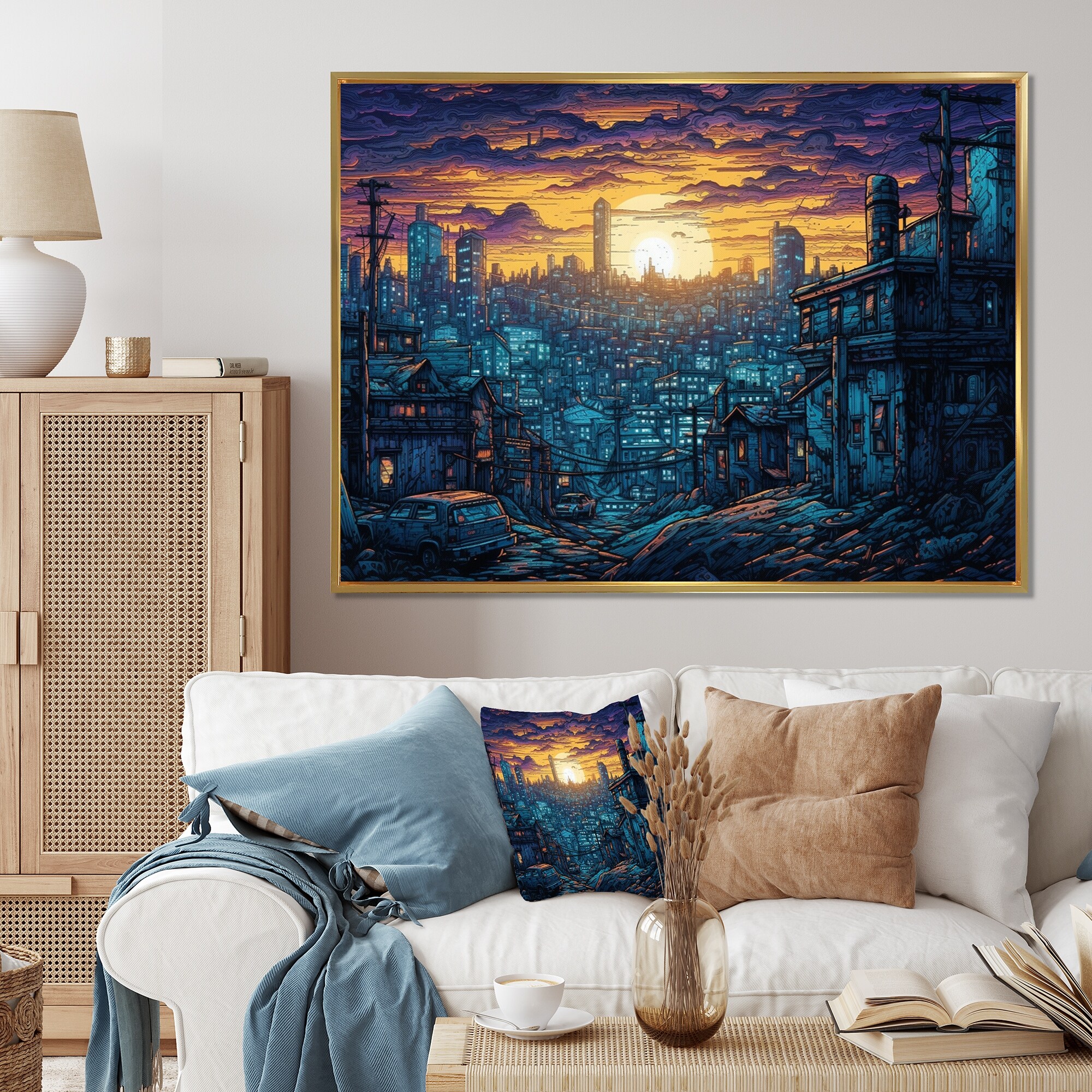 Designart "Yellow And Blue Drama of a Stormy Night City" City Art Deco Framed Wall Art Prints