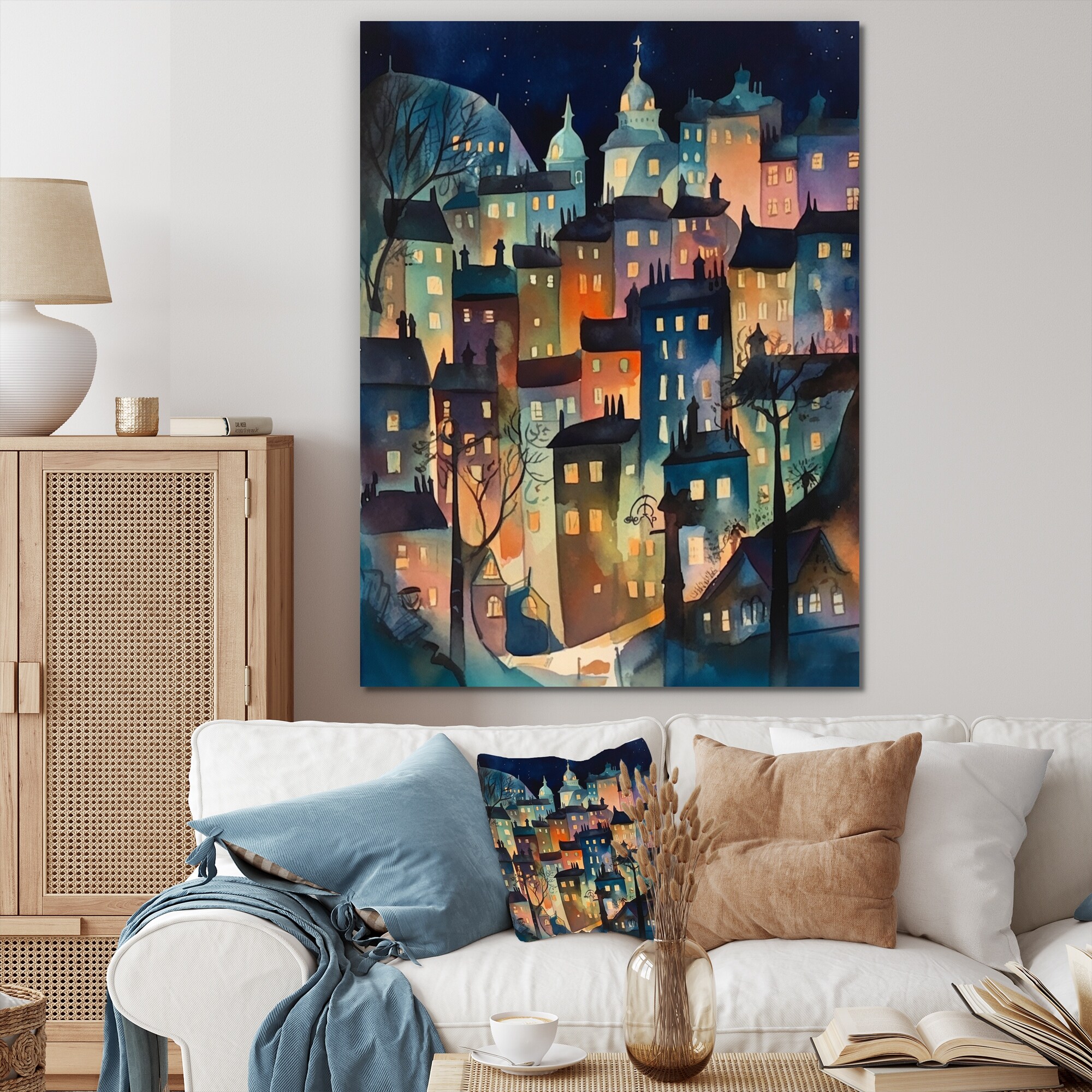 Designart "Colorful Whimsical Skyline I" City Art Deco Framed Wall Art Prints