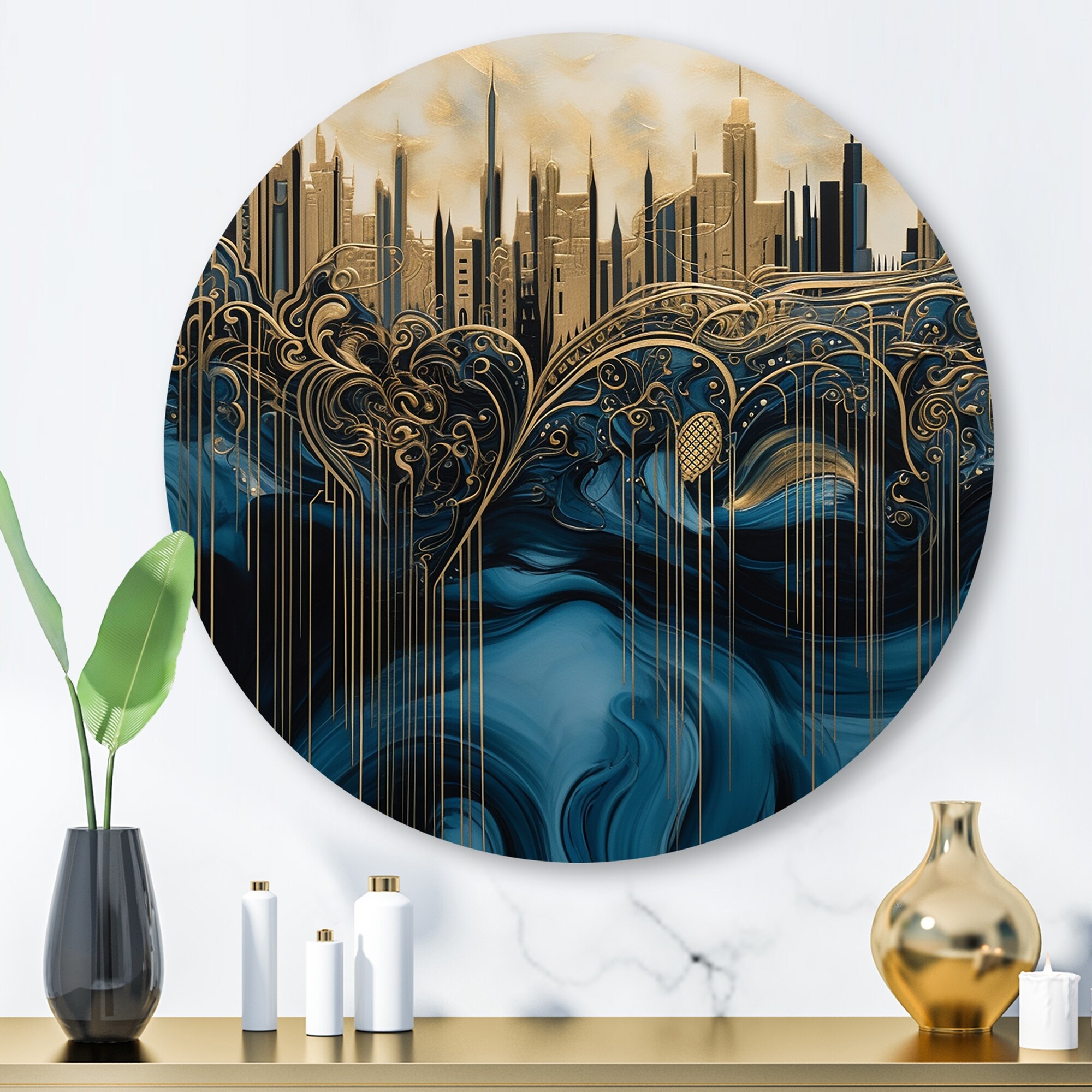 Designart "Gold And Blue Urban Elegance I" City Art Deco Metal Round Wall Art
