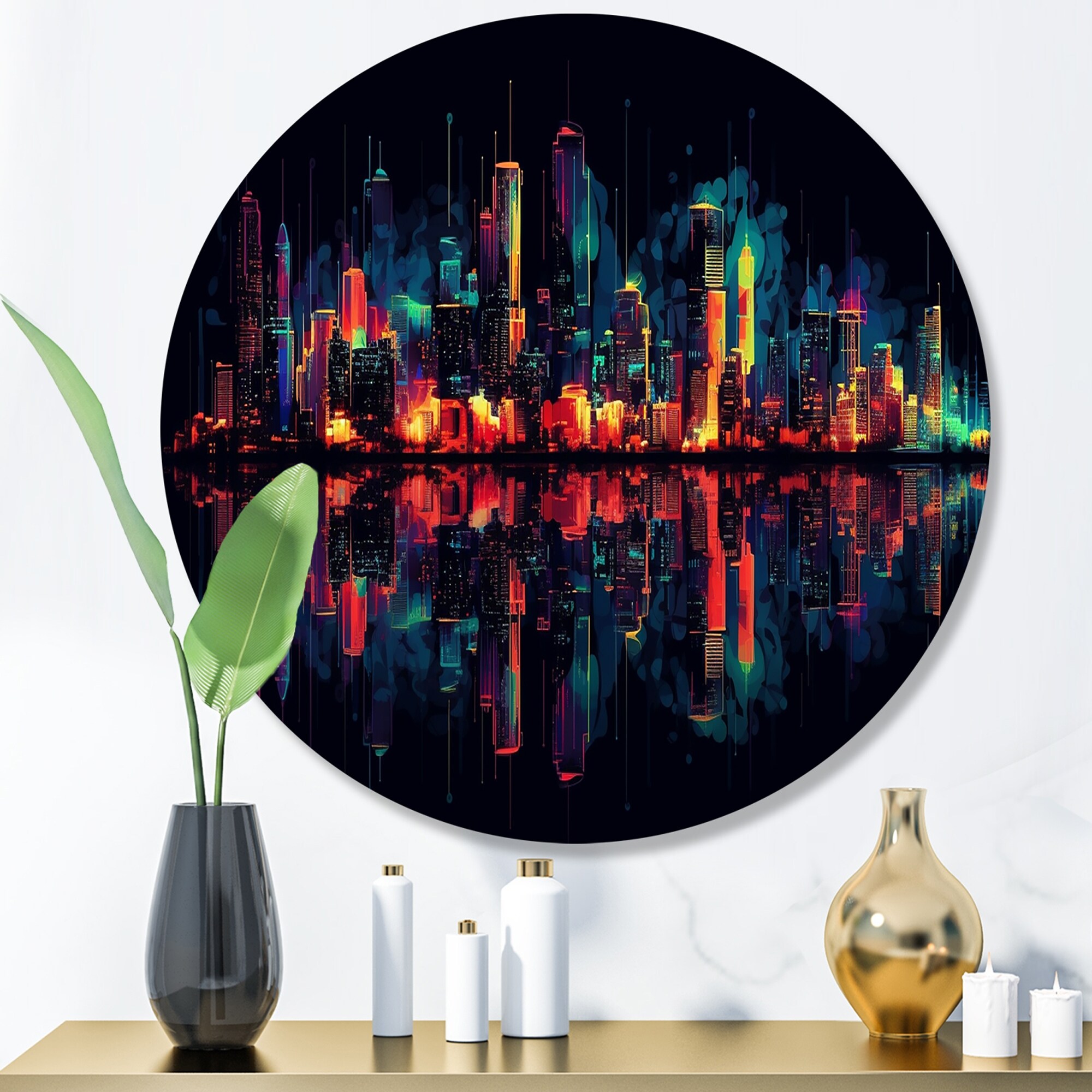 Designart "Orange And Green Deco Horizons" City Art Deco Metal Round Wall Art