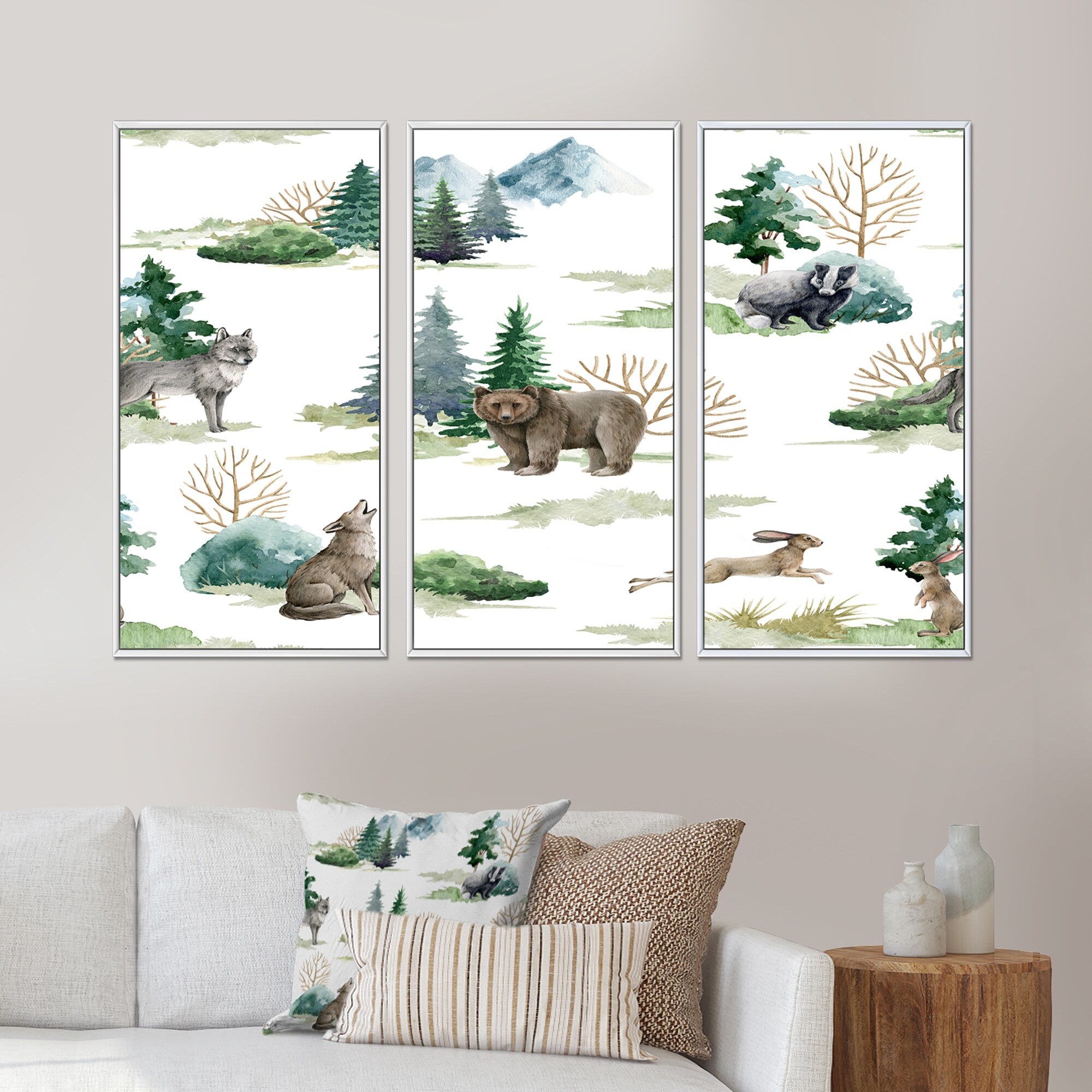 Designart "Forest Bear Wolf Rabbit Badger And Fir Trees" Patterned Framed Canvas Wall Art Set of 3 - 4 Colors of Frames