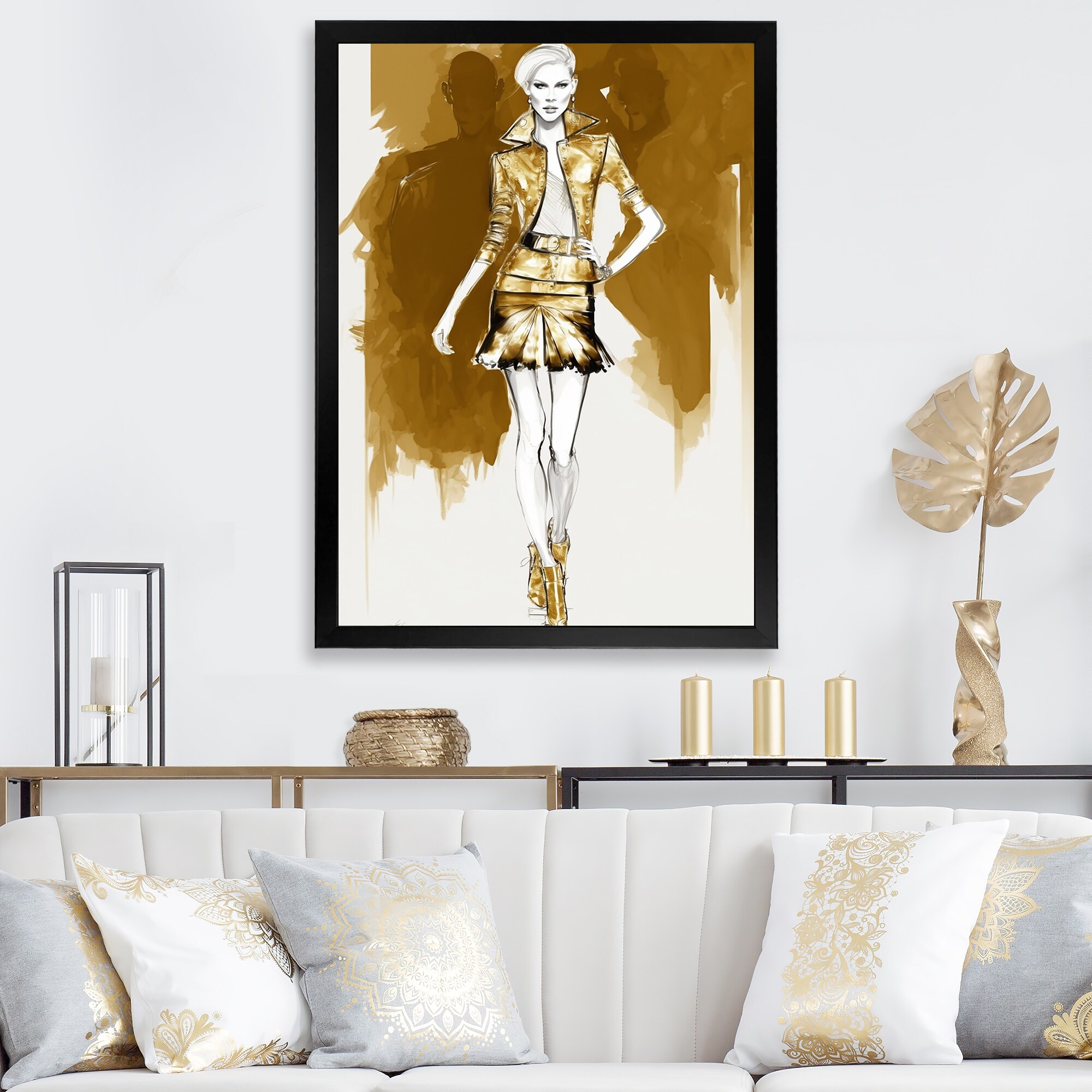 Designart "Catwalk Model Couture in Tones of Gold IX" Fashion Woman Framed Canvas Art Print