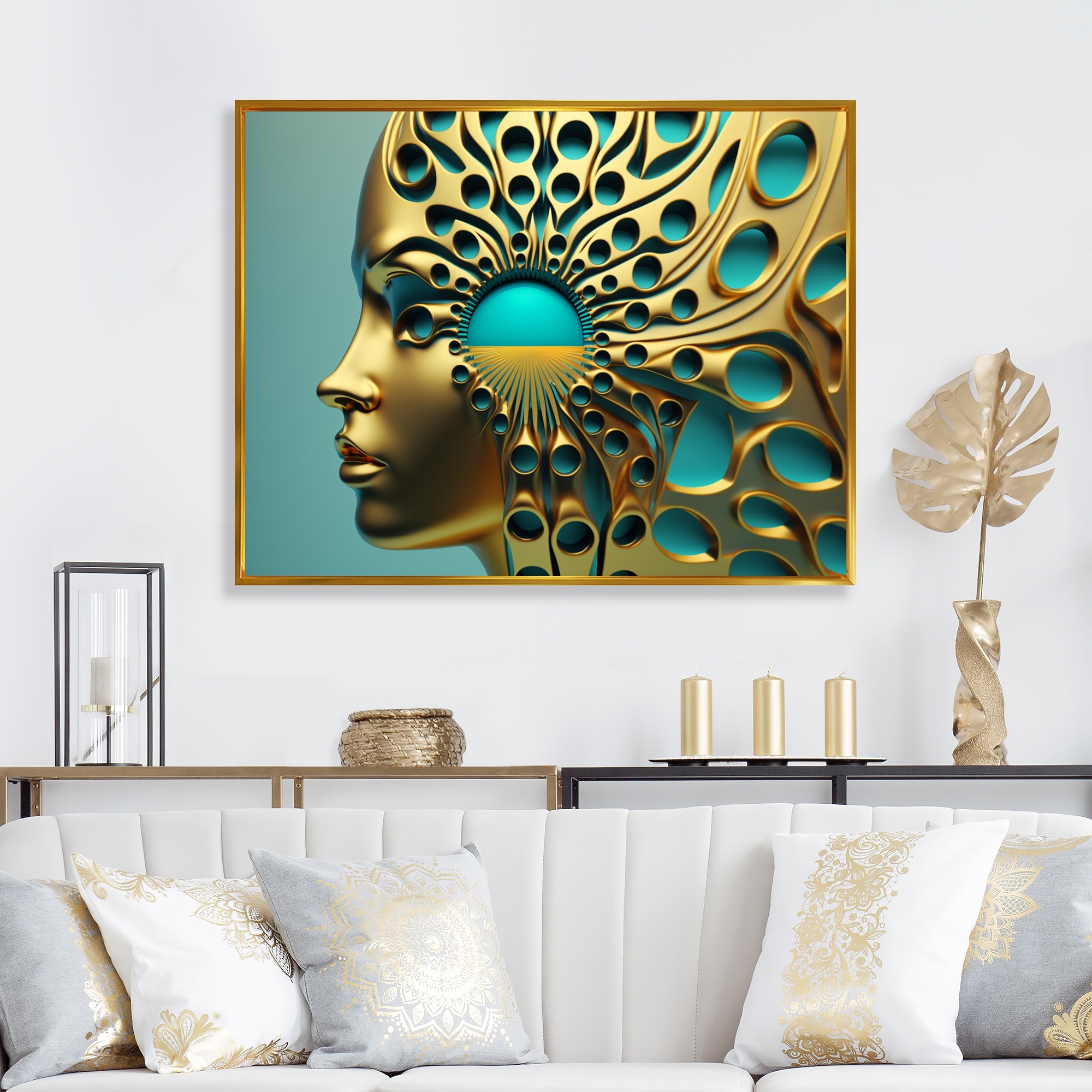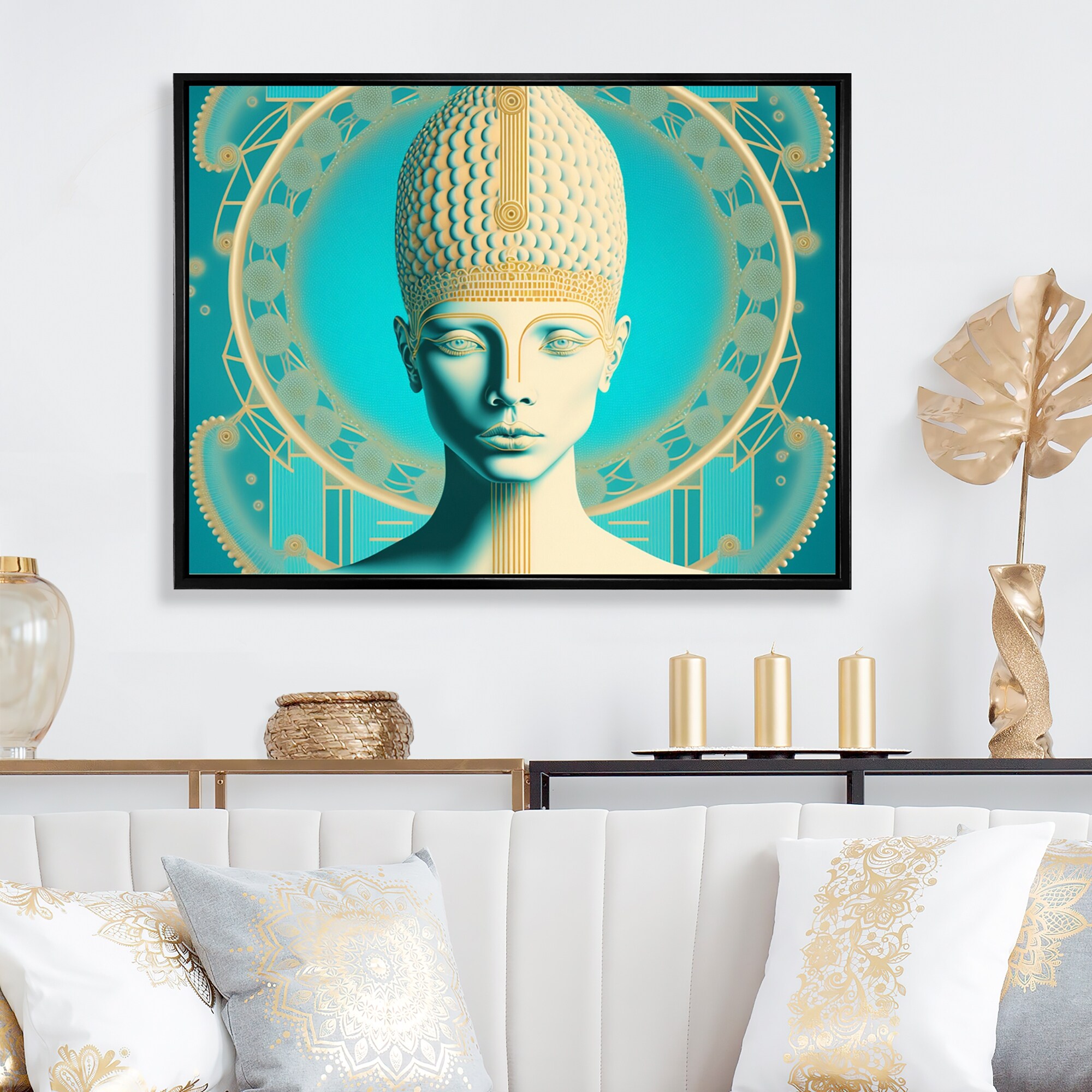 Designart "Visionary Gold And Turquoise Goddess III" Modern Woman Framed Canvas Wall Art Print