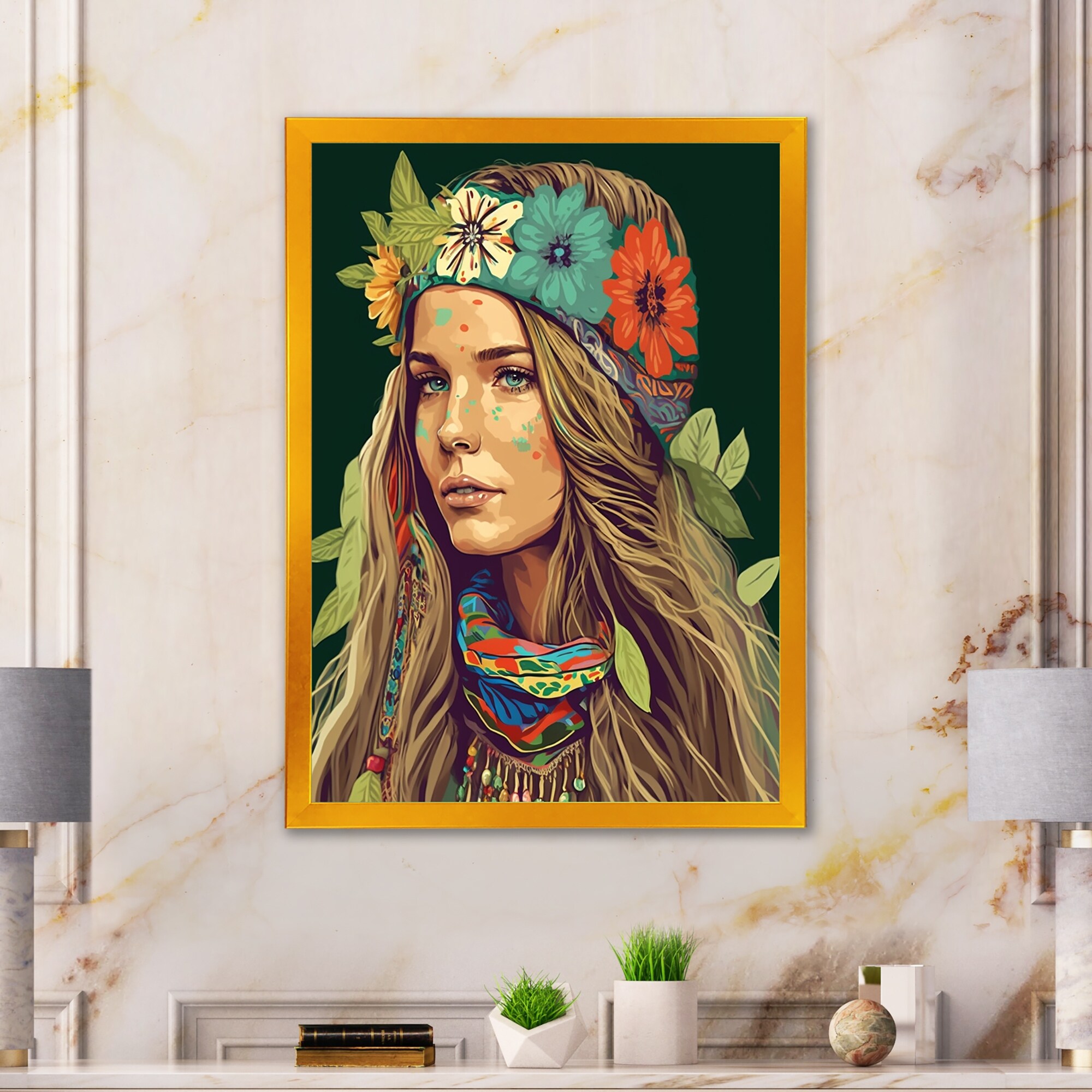 Designart "Young Bohemian Woman With Flower Headband VIII" Boho Woman Framed Canvas Wall Art Print
