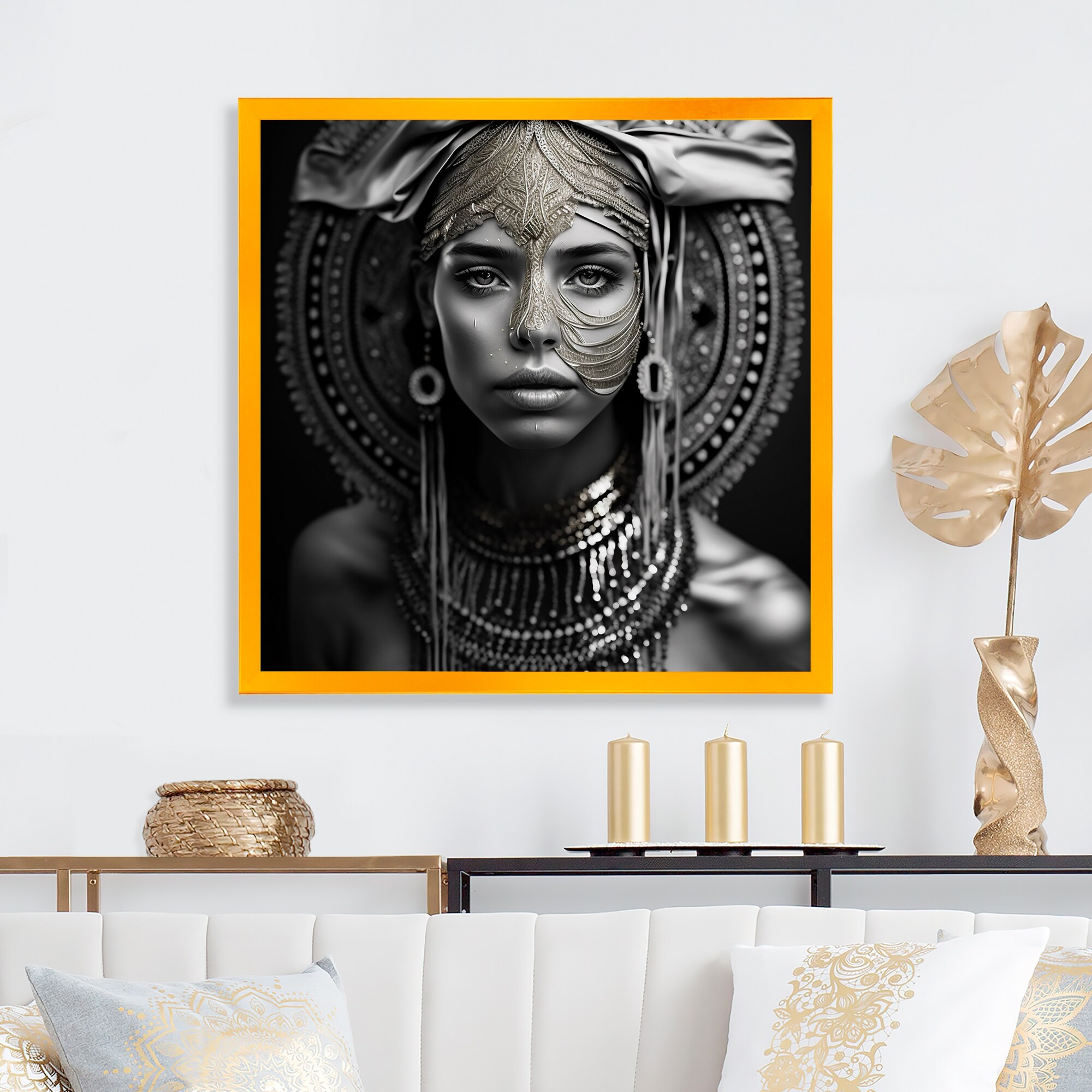 Designart "Bohemian Headdress Vintage Gold" Boho Woman Framed Wall Art Prints