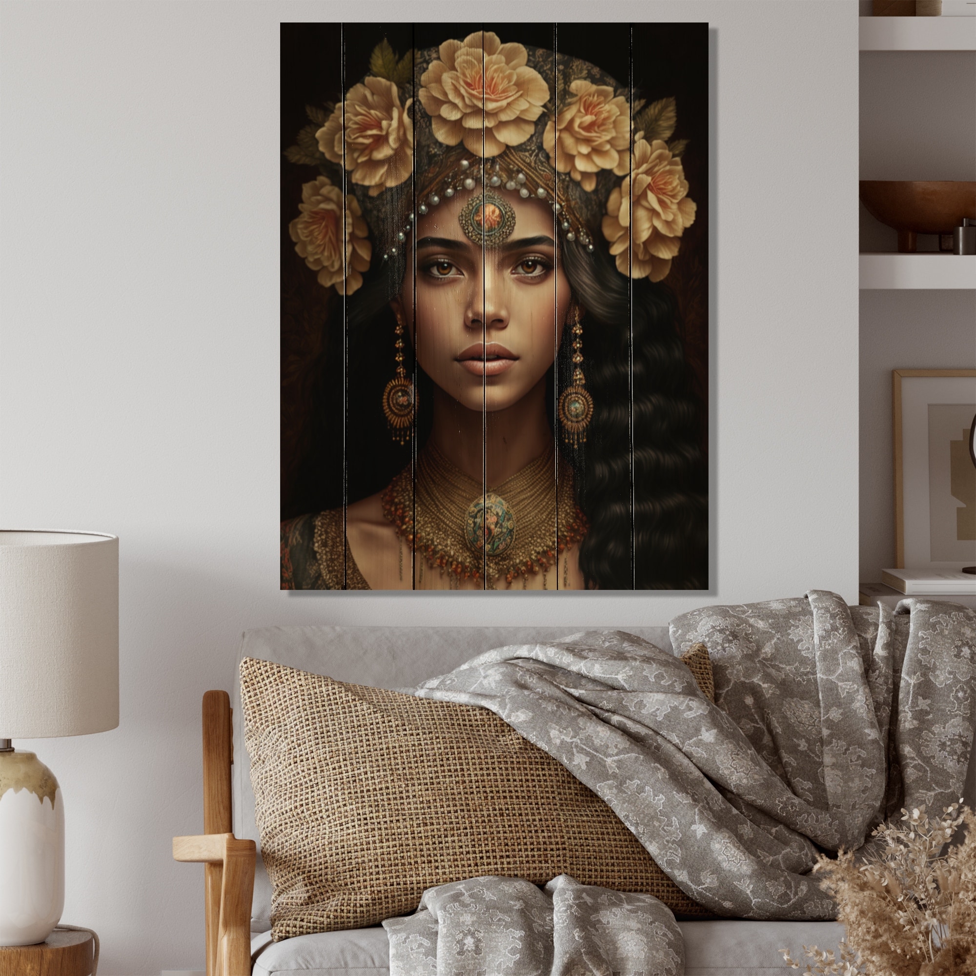 Designart "Young Bohemian Woman With Flower Headband I" Boho Woman Print on Natural Pine Wood