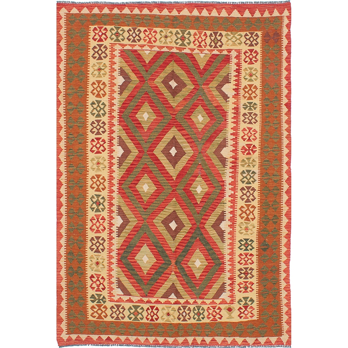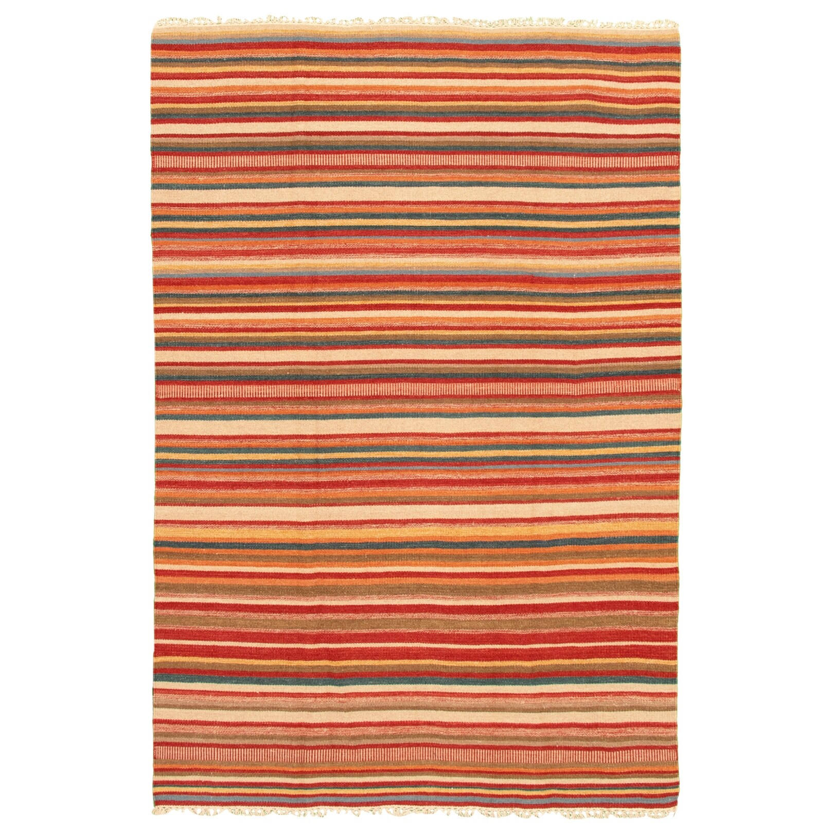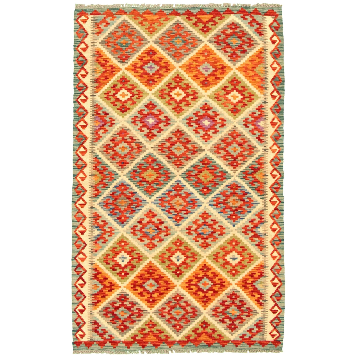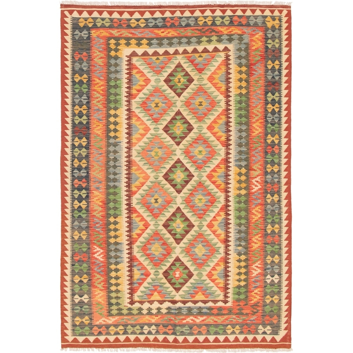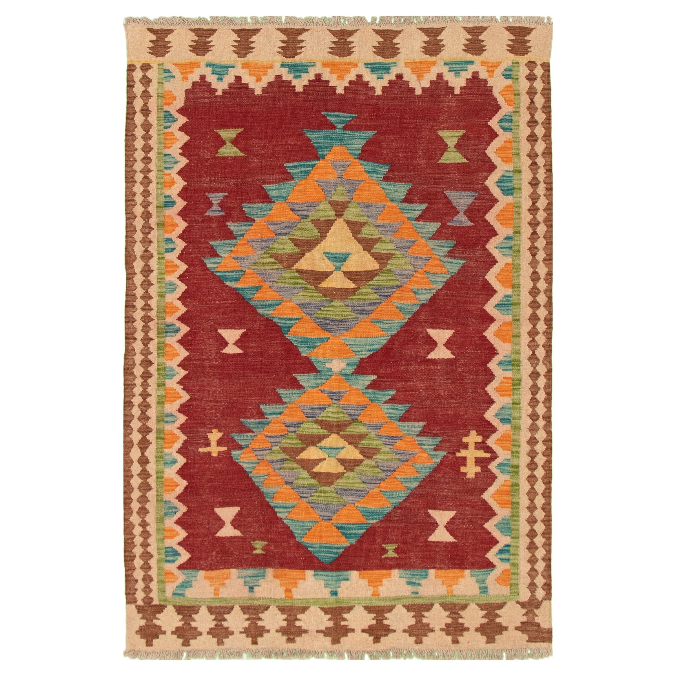 ECARPETGALLERY Flat-weave Bold and Colorful Ivory, Red Wool Kilim - 4'0 x 6'6