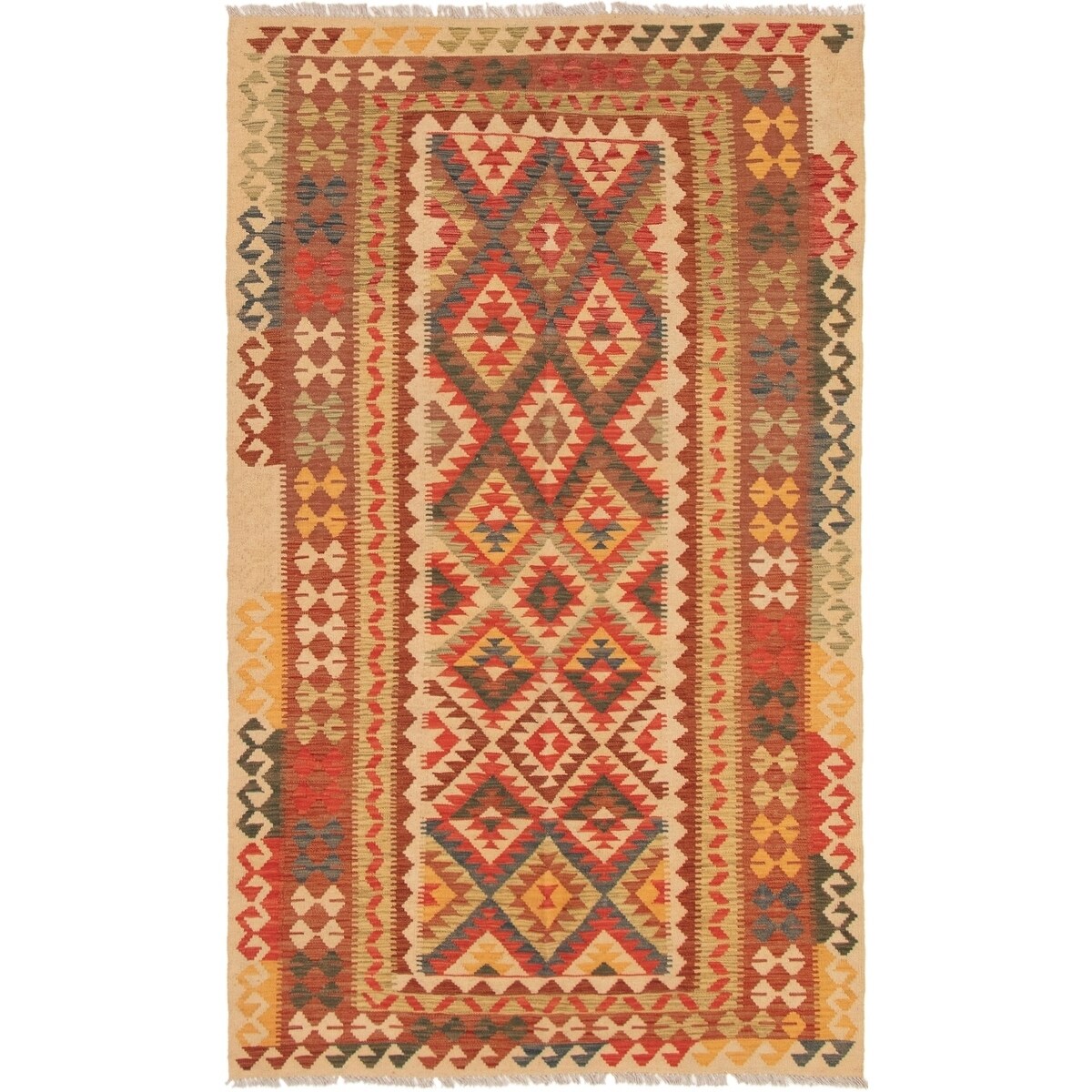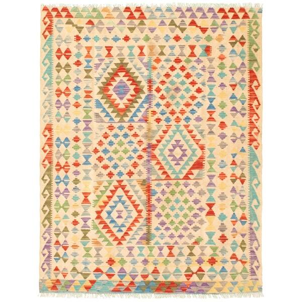 ECARPETGALLERY Flat-Weave Bold and Colorful Ivory Wool Kilim - 5'2 x 6'6