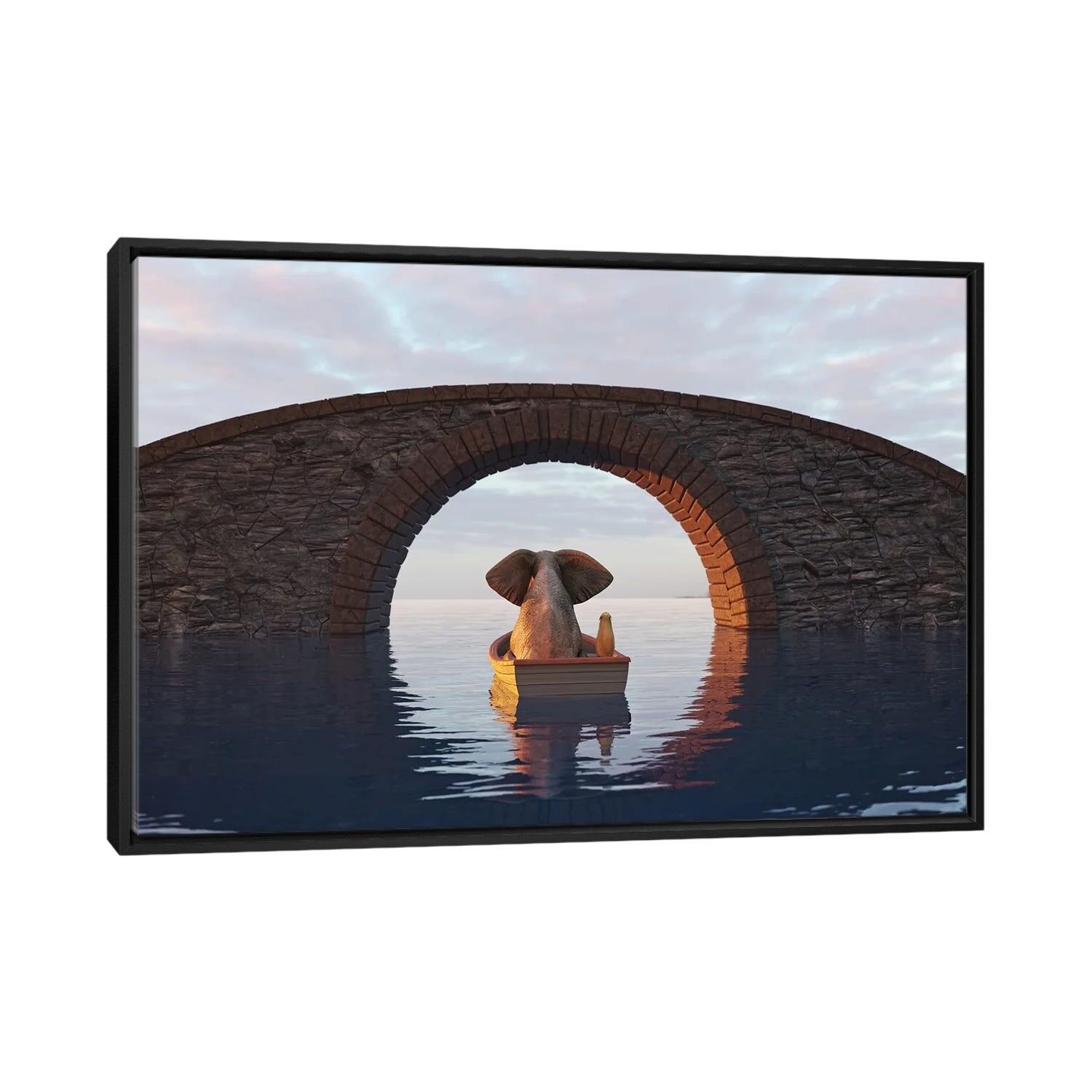 iCanvas "Elephant And Dog Float in A Boat Under the Bridge II" by Mike Kiev Framed