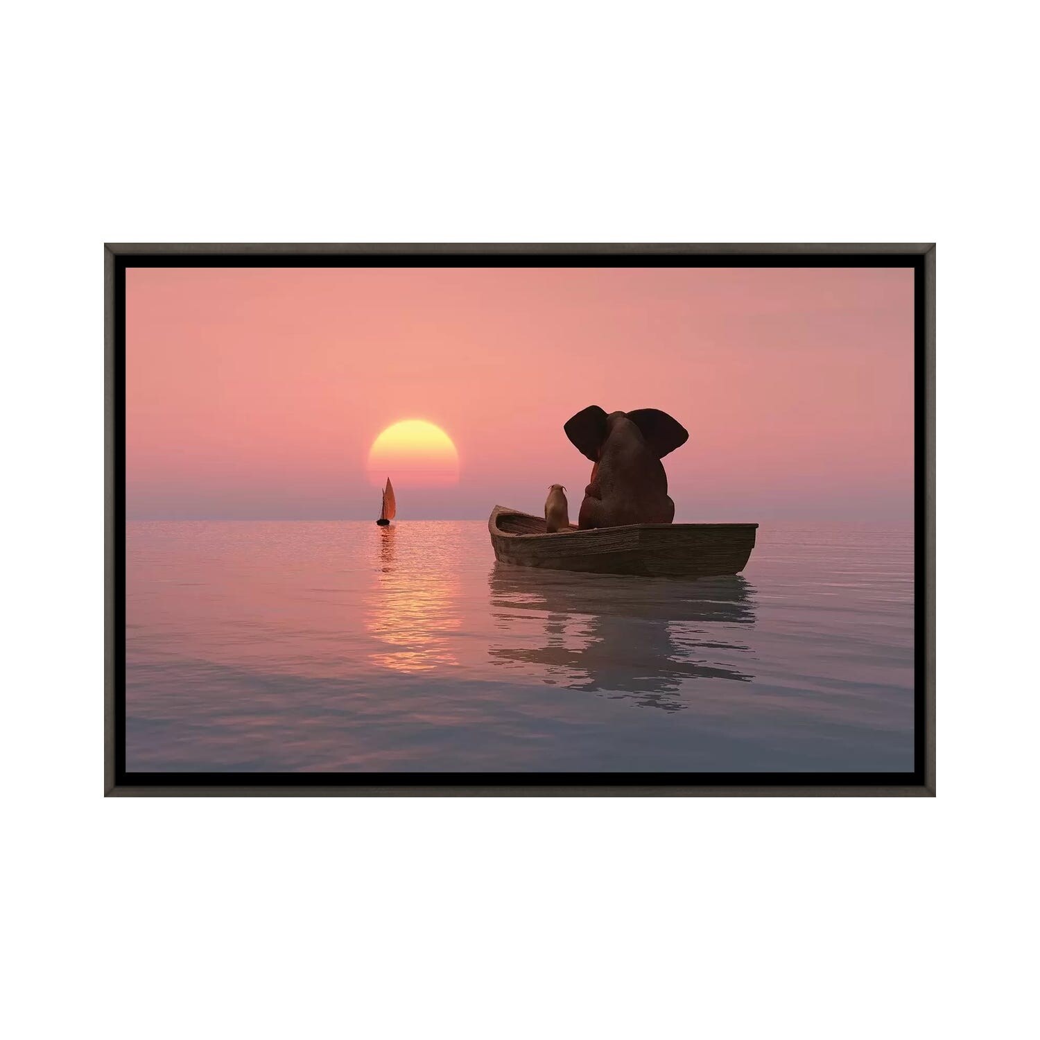 iCanvas "Elephant And Dog Are Floating in A Boat At Sunset" by Mike Kiev Framed