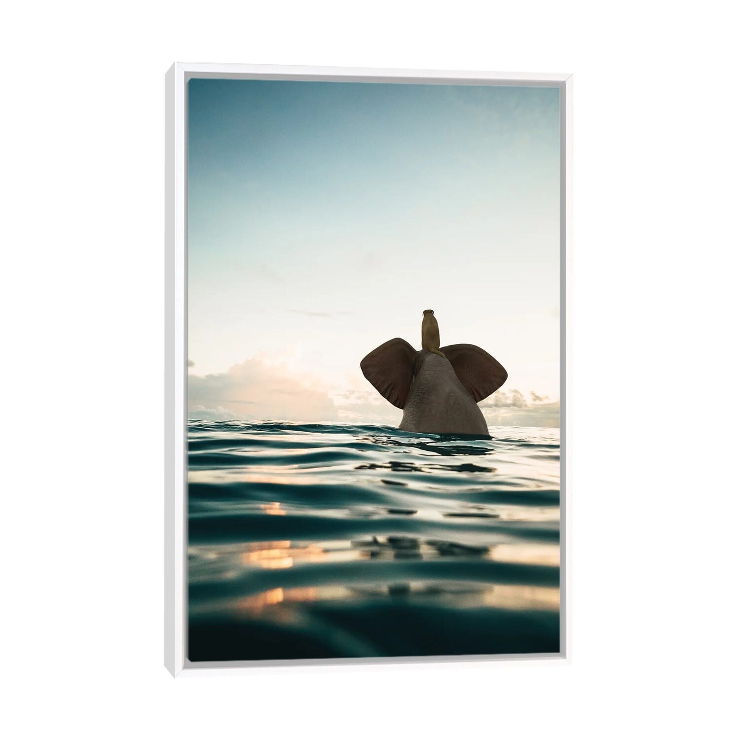 iCanvas "Elephant And Dog Swim in the Sea" by Mike Kiev Framed Canvas Print
