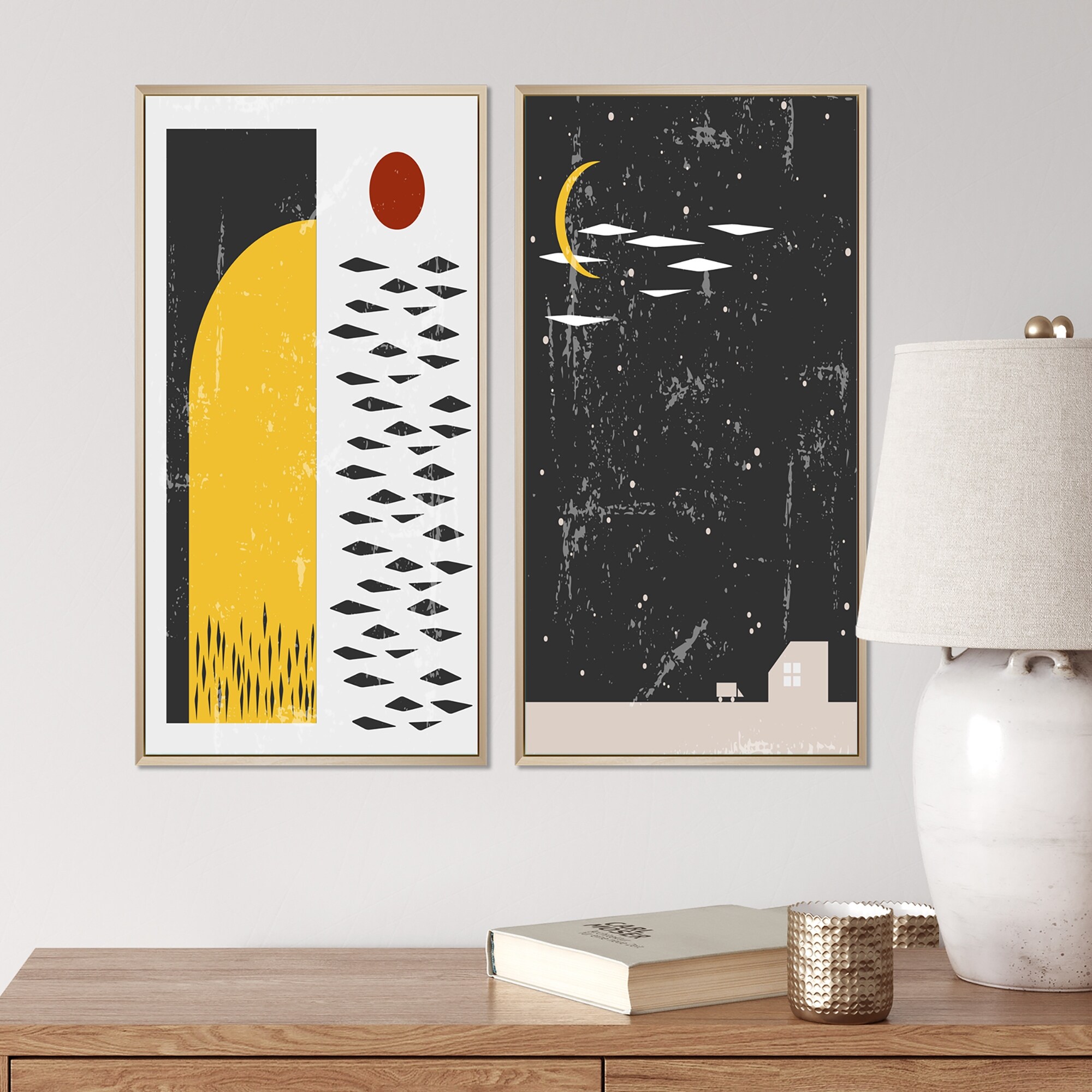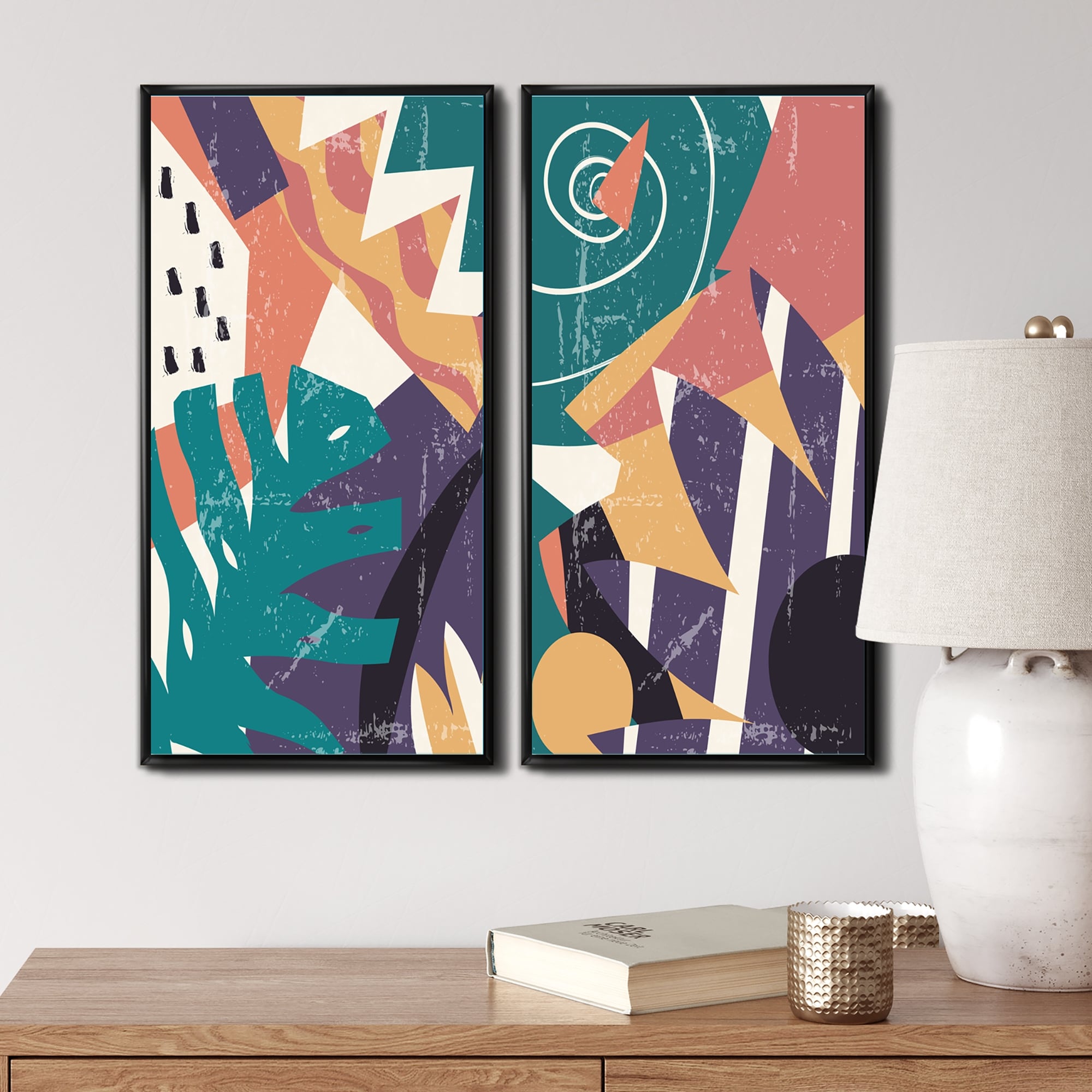 Designart "Japanese Abstract Geometrics in Retro Colors I" Geometric Framed Art Set of 2 Pieces