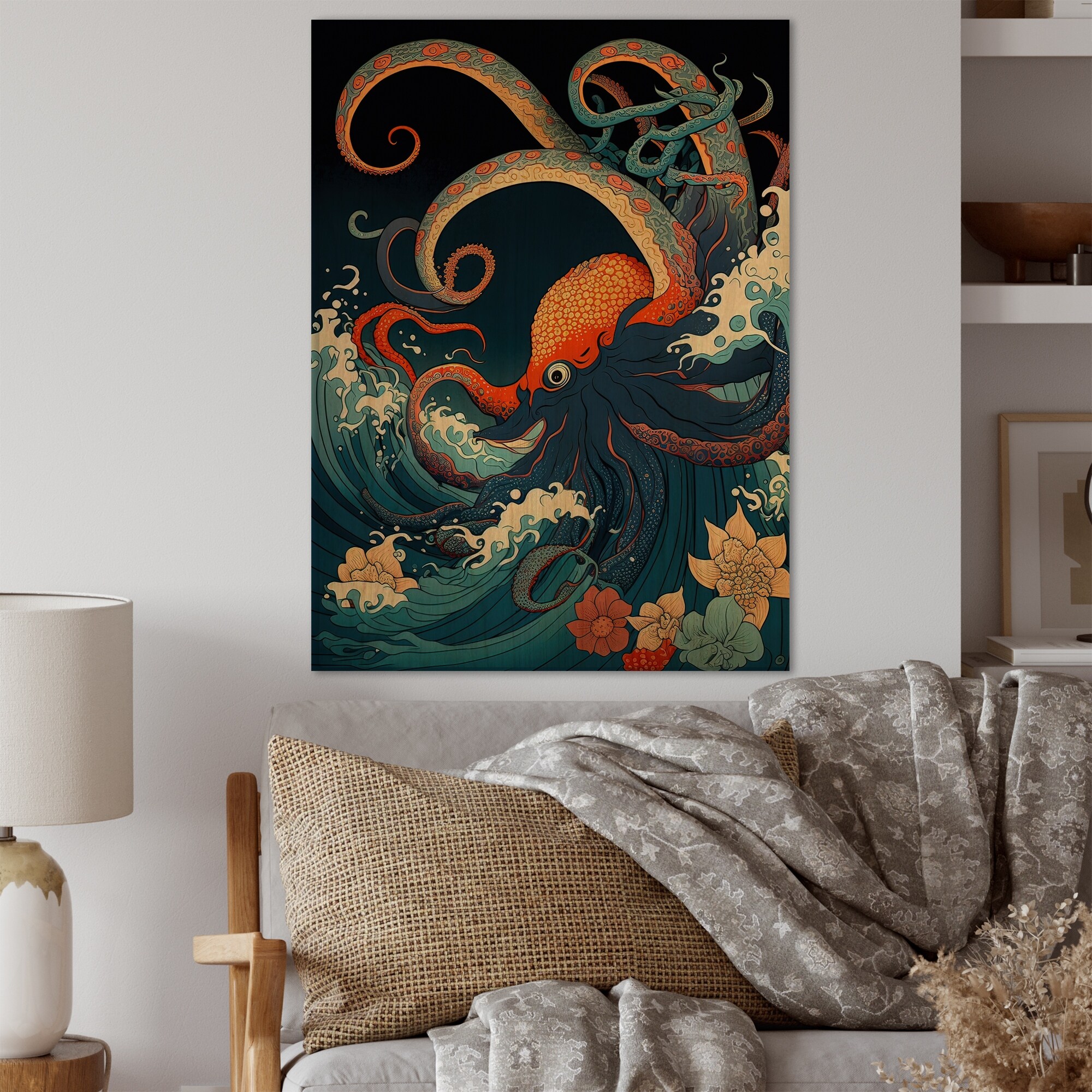 Designart 'Japanese Landscape With Octopus V' Japon Landscape Wood Wall Art - Natural Pine Wood
