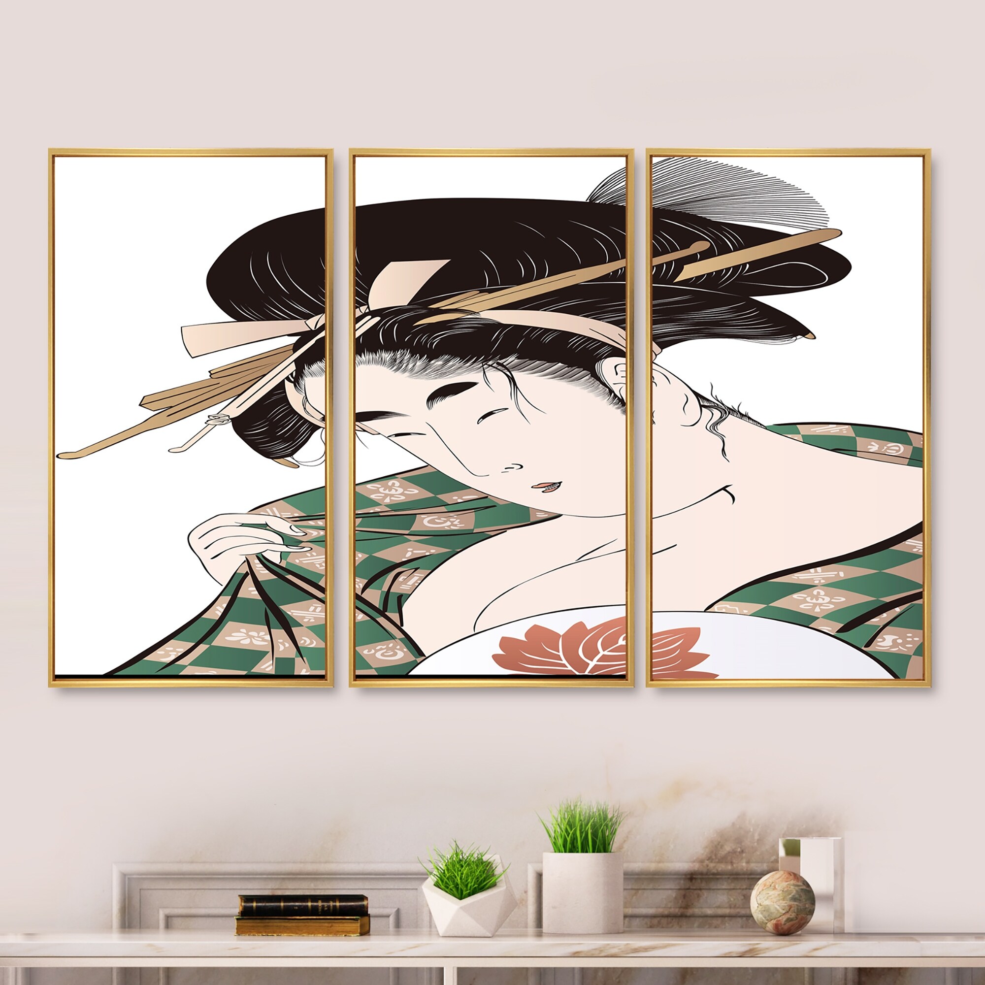 Designart "Japanese Ukiyo-E Woman" Mid-Century Modern Framed Wall Decor Set of 3 - 4 Colors of Frames