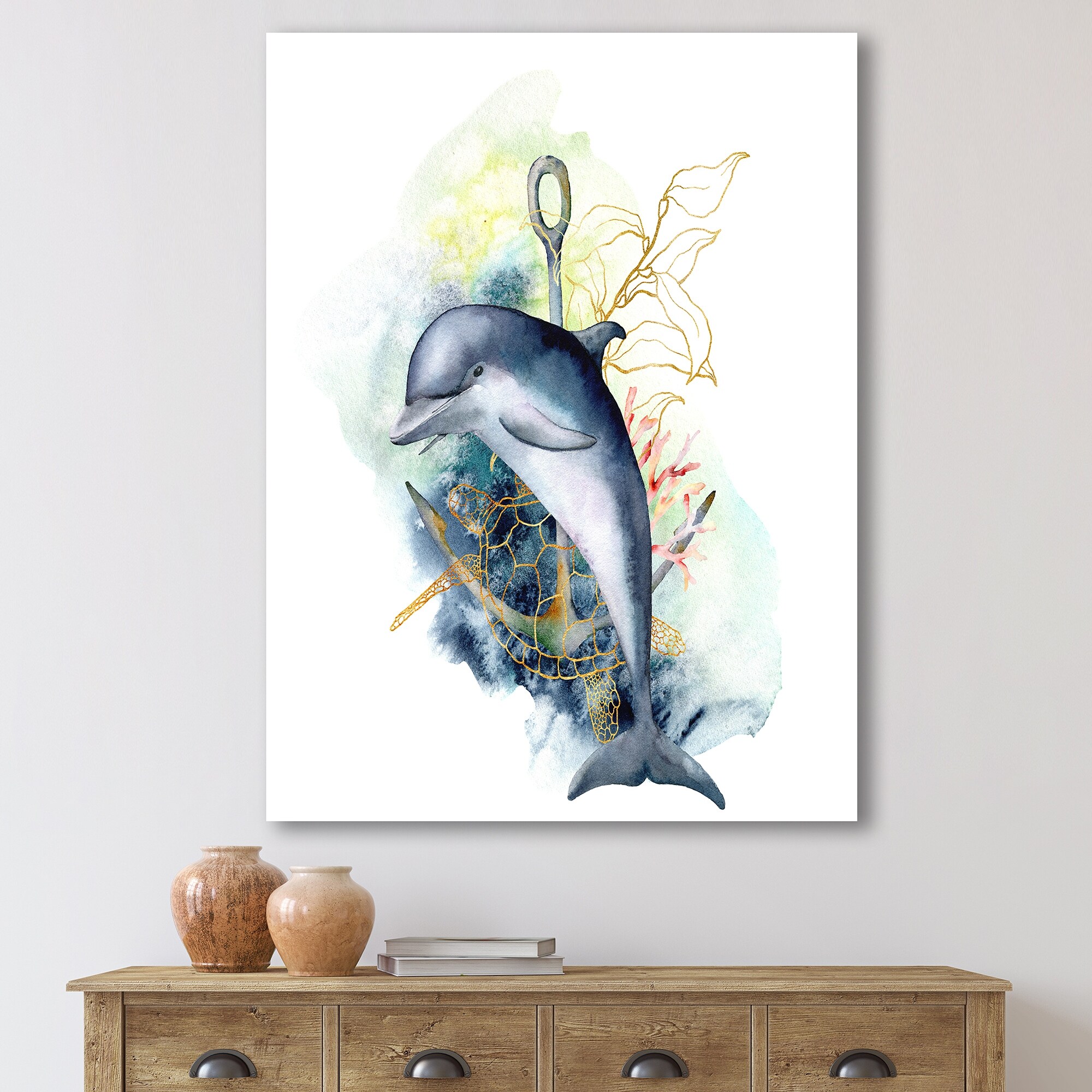 Designart "Dolphin Turtle Anchor & Linear Coral Reef Plants" Nautical & Coastal Canvas Wall Art Print
