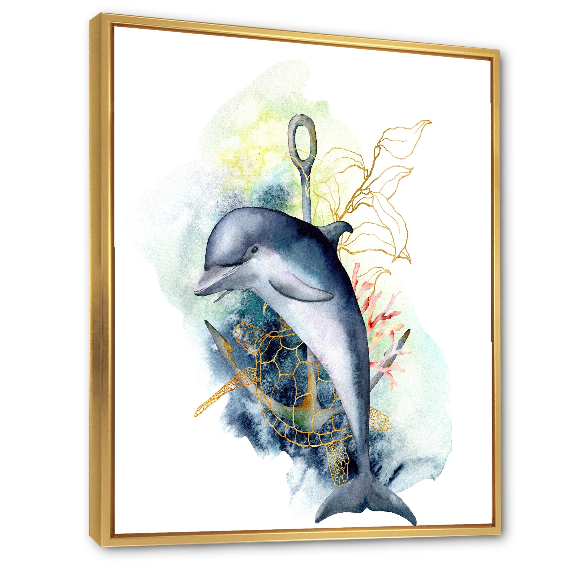 Designart "Dolphin Turtle Anchor & Linear Coral Reef Plants" Nautical & Coastal Framed Canvas Wall Art Print