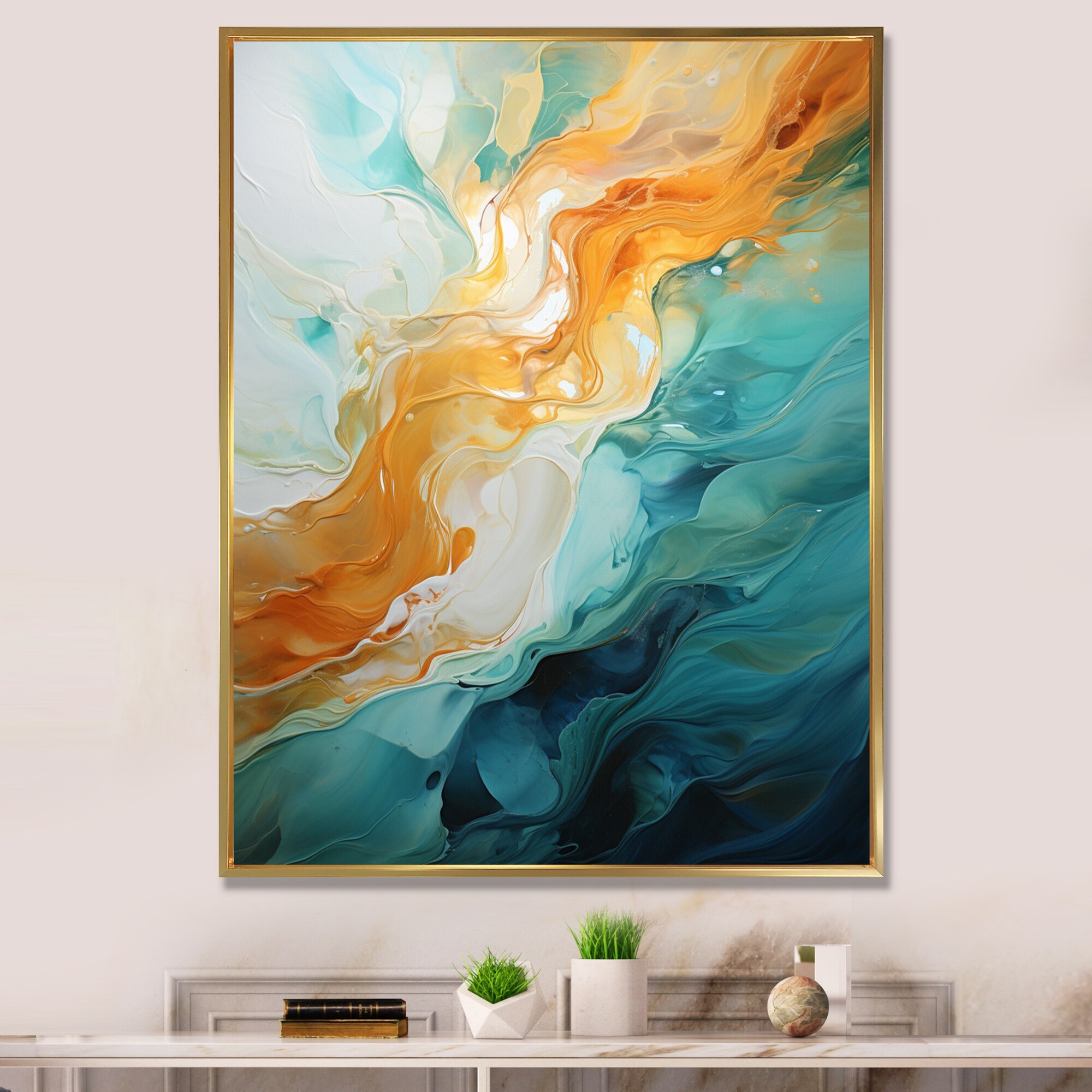 Designart "Yellow Teal Abstract Fractal Infinite Ripples" Fractals Framed Wall Art Living Room