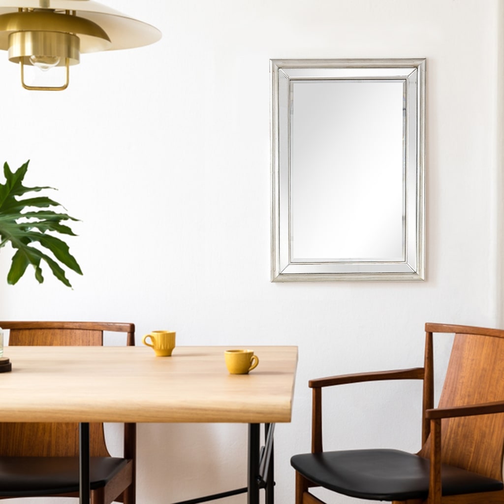 Contemporary Style Rectangular Wooden Frame Wall Mirror, Silver
